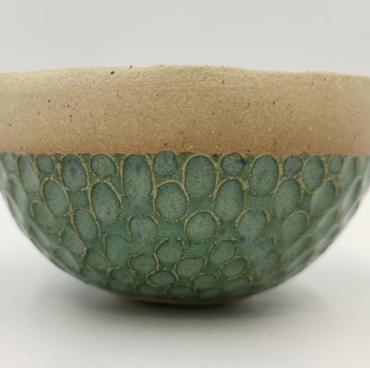 Small coiled bowl with a hand-carved texture finished with a kiwi green glaze and white interior.