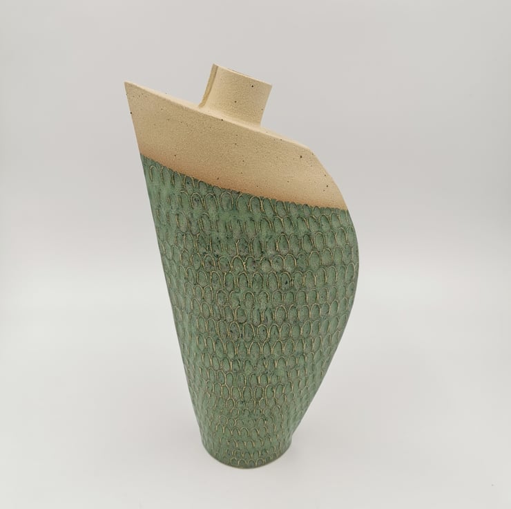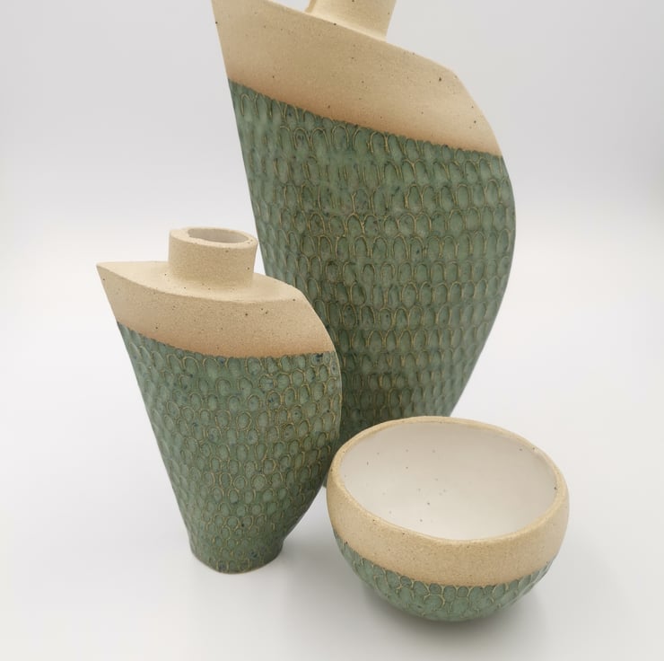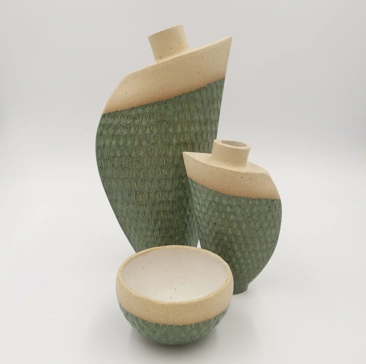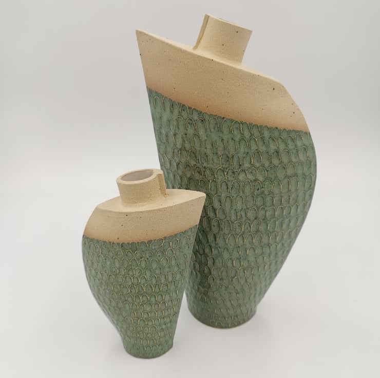 Slab built vases in a flecked stoneware clay with a kiwi green glaze.