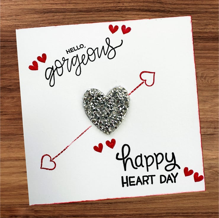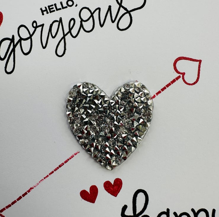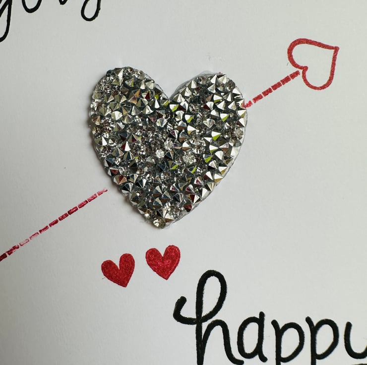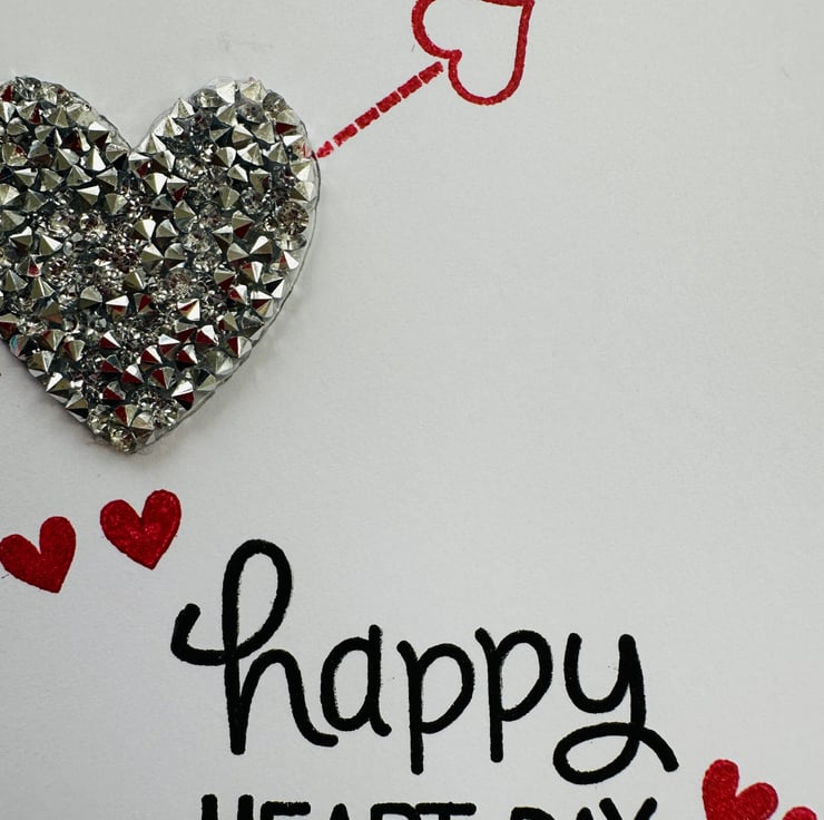 A contemporary card with a gorgeous silver textured heart surrounded by love messages and red love hearts.