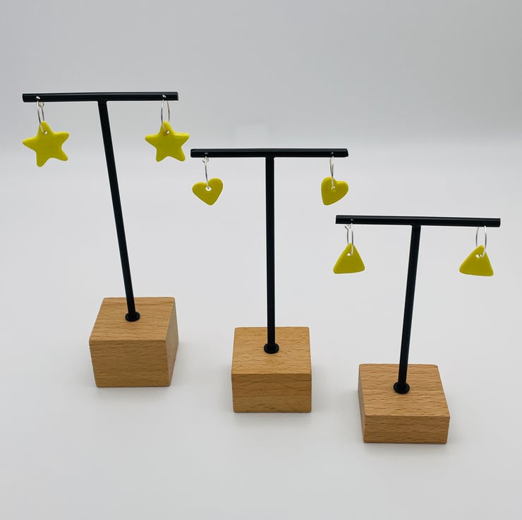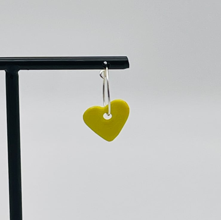 My handcrafted porcelain sunshine yellow sweetheart earrings are on sterling silver hoops. So light you won't know you're wearing them.