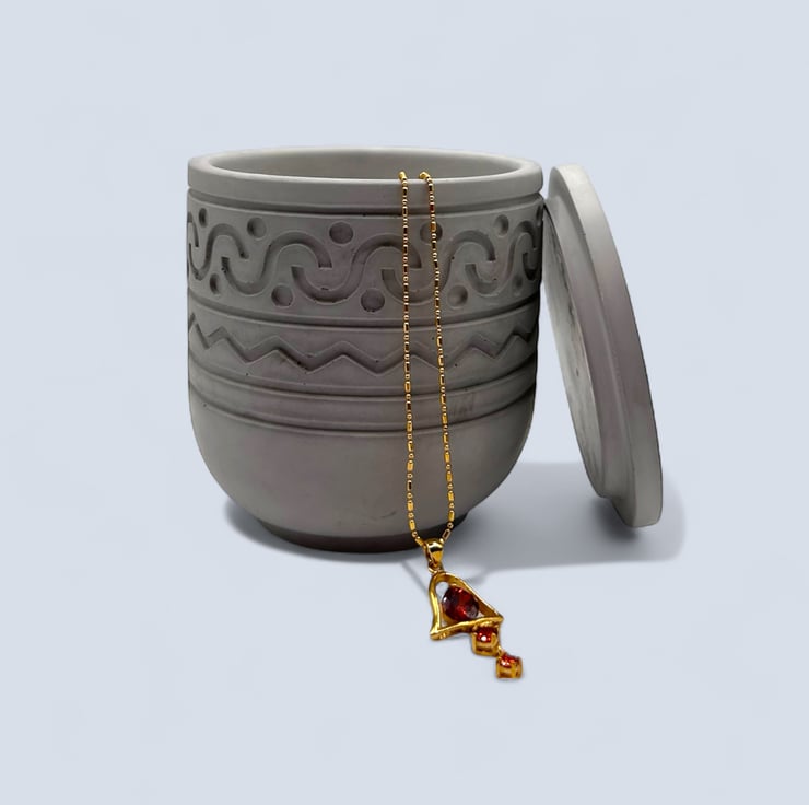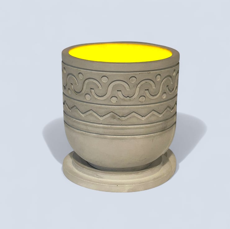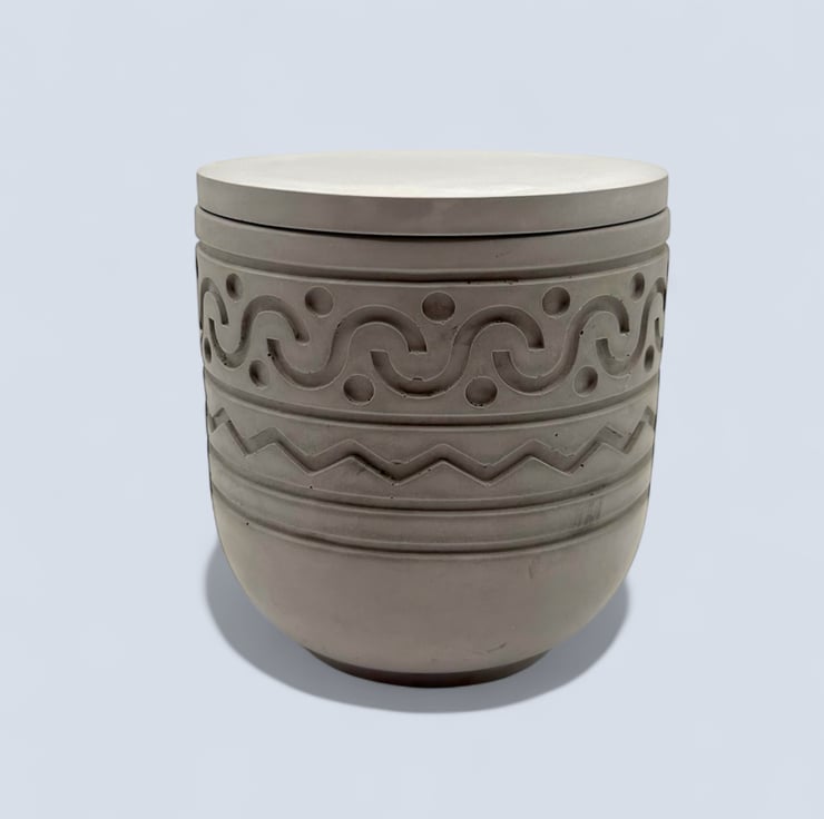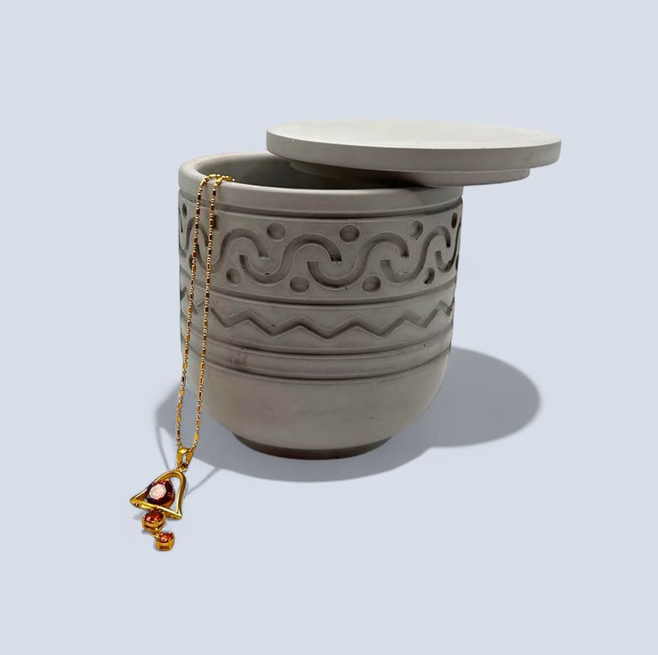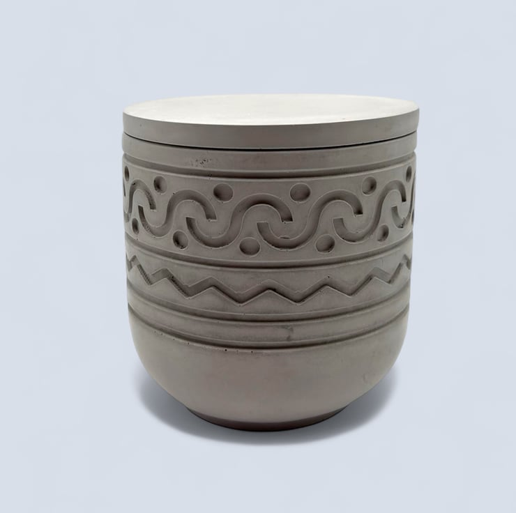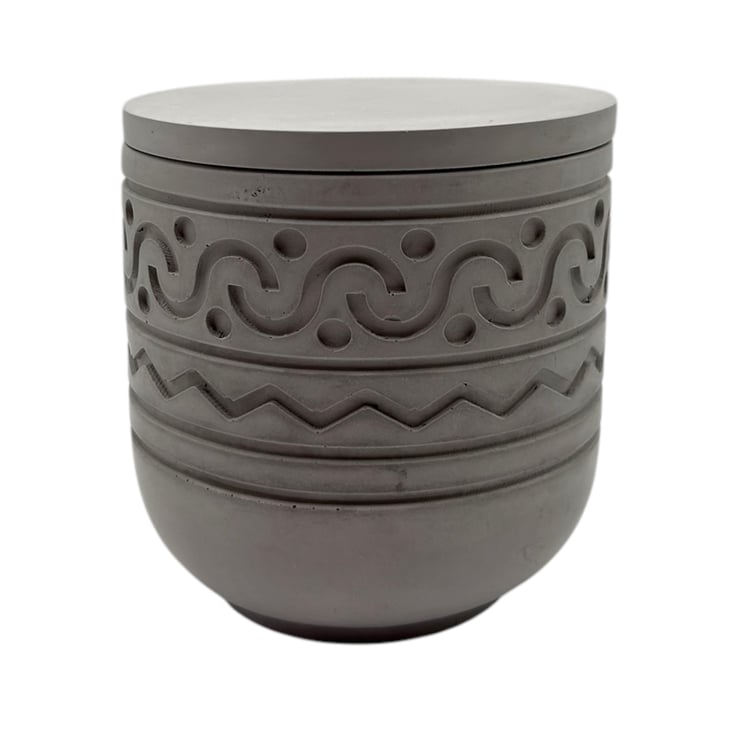 This trinket pot features a geometric design with lines, S-curves, and circles around the upper part, as well as zigzag and straight lines lower down. This unique grey jewellery box is crafted from British Crystacal R. With a smooth and tactile finish, it is perfect for storing keepsakes, trinkets, jewellery, or small treasures. Additionally, it can serve as a candle jar for tealights, candle sand or pillar candles; the lid can also function as a coaster to protect your surfaces from heat.
