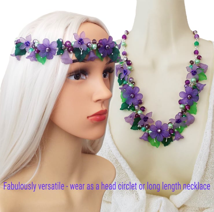 Beautiful flower headpiece that can also be worn as a necklace. A lovely array of Lucite & acrylic purple & green flowers & leaves & a myriad of gorgeous glass beads & pearls each individually hand wired on to a silver plated chain. Finished with a beaded extender chain to the back & fastens with a lobster claw clasp.
