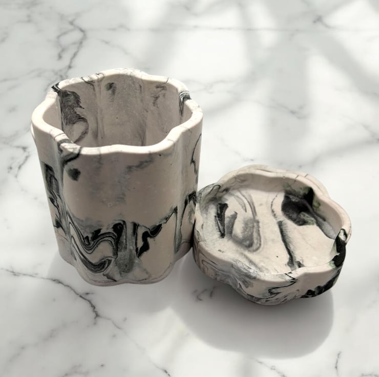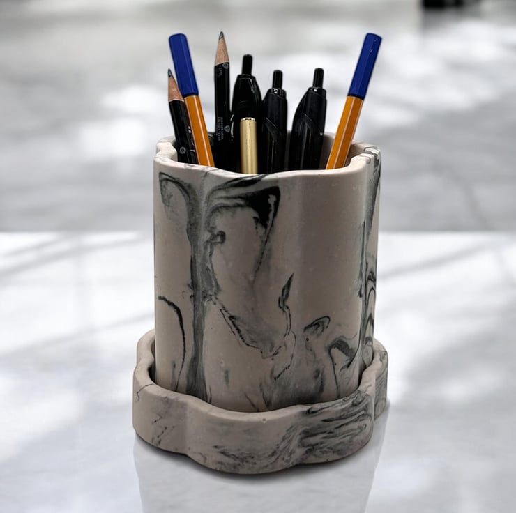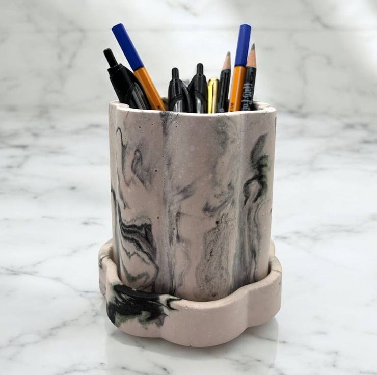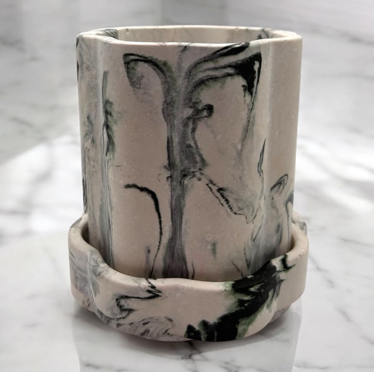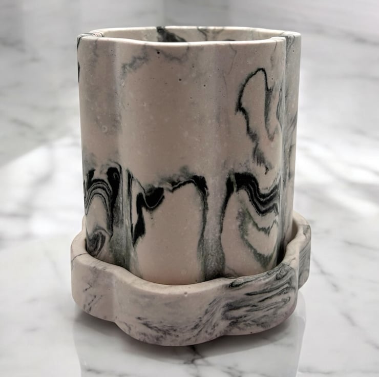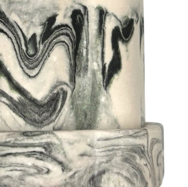 This handcrafted black and white pot and saucer set features a stylish fluted design with a unique marbled effect. It has a variety of uses, such as serving as a plant pot, a storage container with the tray fitting securely on top to act as a lid, or a desk organiser with the tray able to hold smaller stationery items like erasers and paper clips, among many other possibilities.