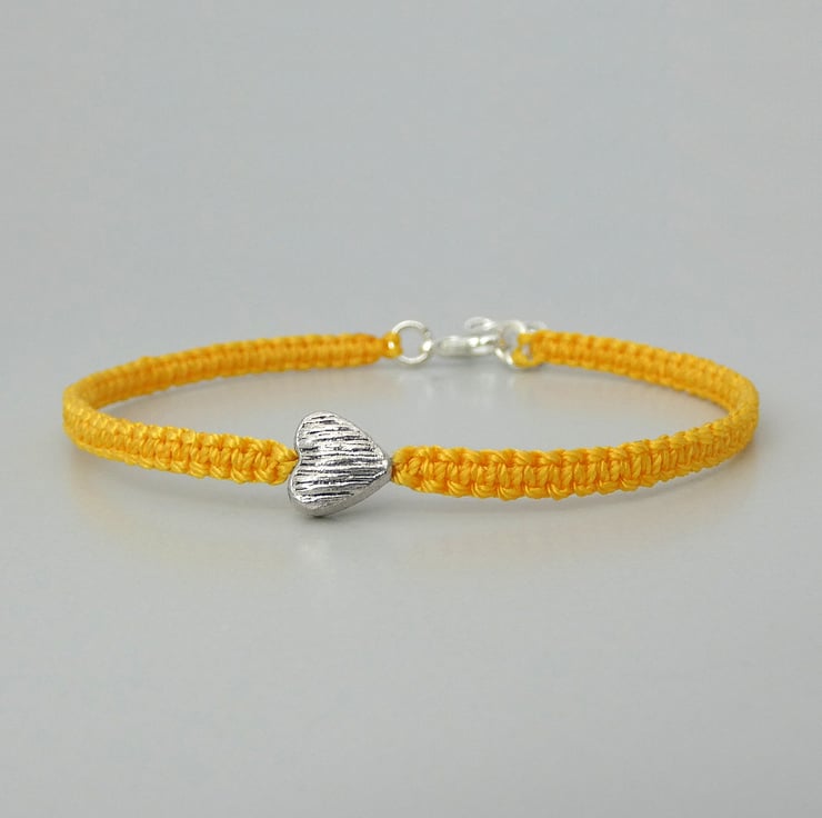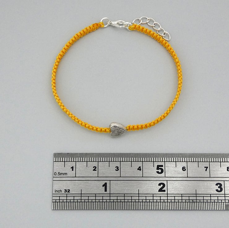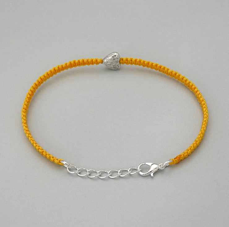 Golden yellow nylon macramé bracelet with a silver plated textured heart charm. The bracelet is 7" long and can be extended up to 8" using the extender chain on the end of the bracelet. This makes a perfect gift for a loved one when you do not know the exact wrist size of your recipient.