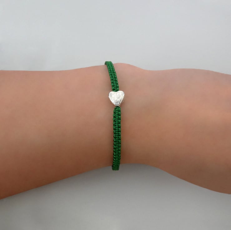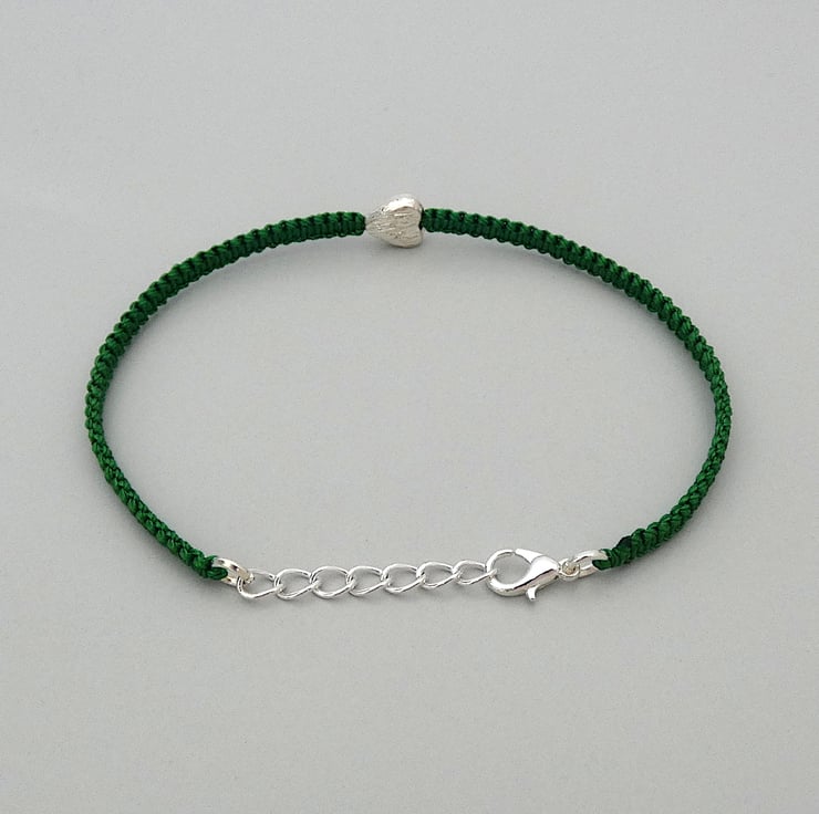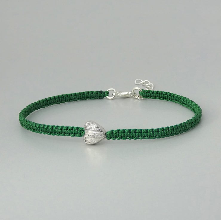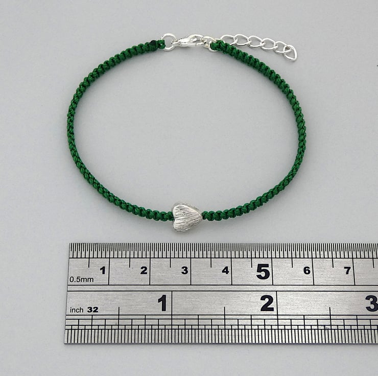 Christmas green nylon macramé bracelet with a silver plated textured heart charm. The bracelet is 7" long and can be extended up to 8" using the extender chain on the end of the bracelet. This makes a perfect gift for a loved one when you do not know the exact wrist size of your recipient.