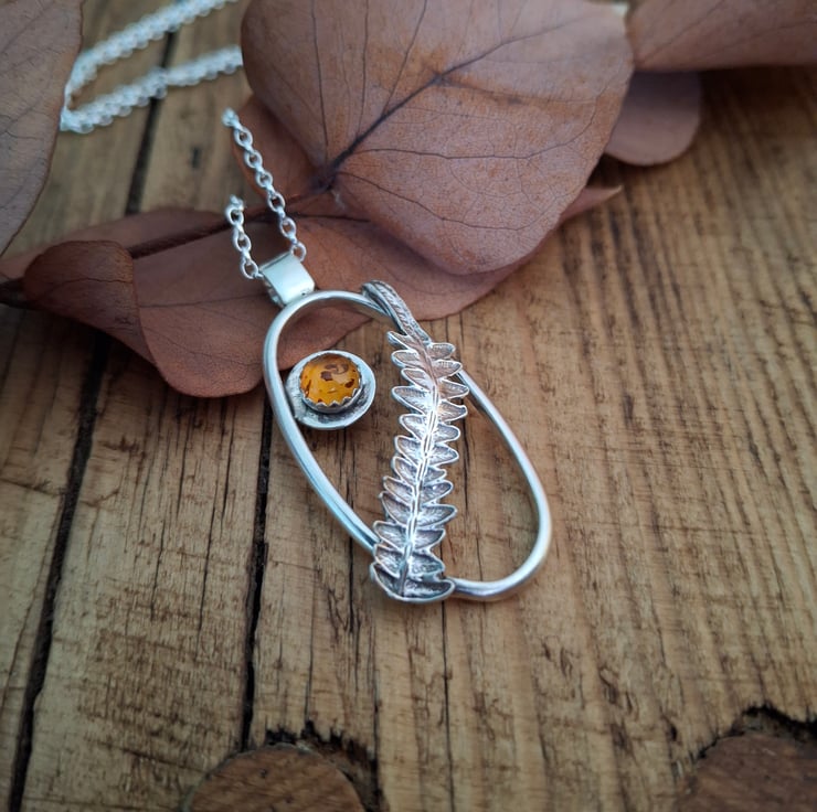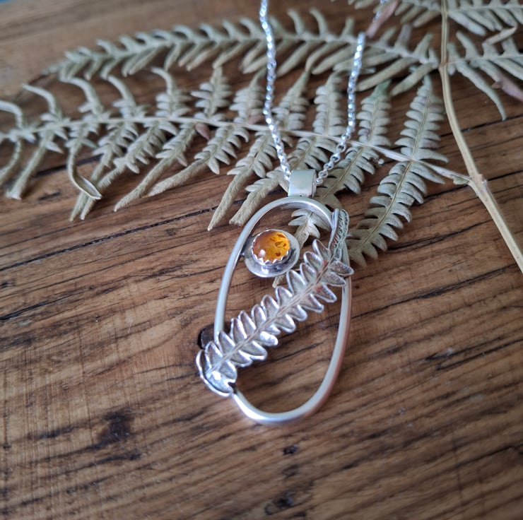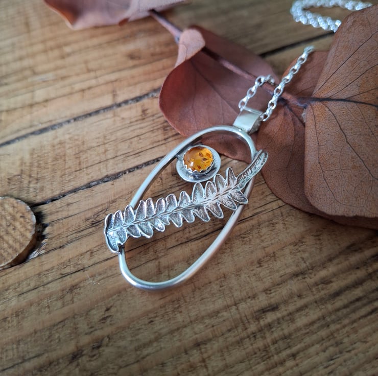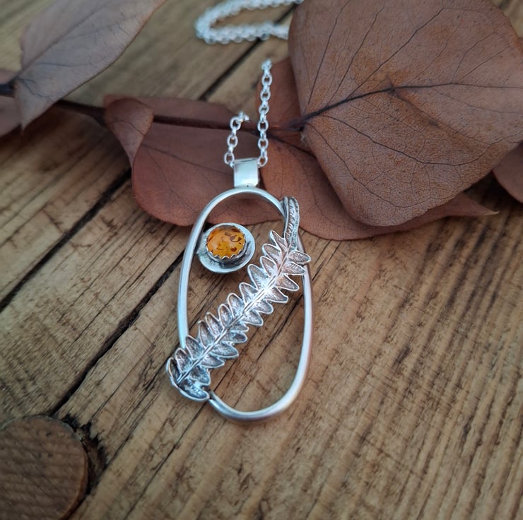 I brought these beautiful, very organic looking fern leaves back from a trip to Kielder forest last autumn. After carefully drying them, I applied thin layers of fine silver to preserve the texture and not damage the leaf. Once fired the leaves burn away and reveal shiny curled silver fern charms. The leaf has a beautiful colourful rainbow patina with gives a great contrast to the sturdy silver frame. I paired it with a warm pale amber stone and a sturdy silver chain.