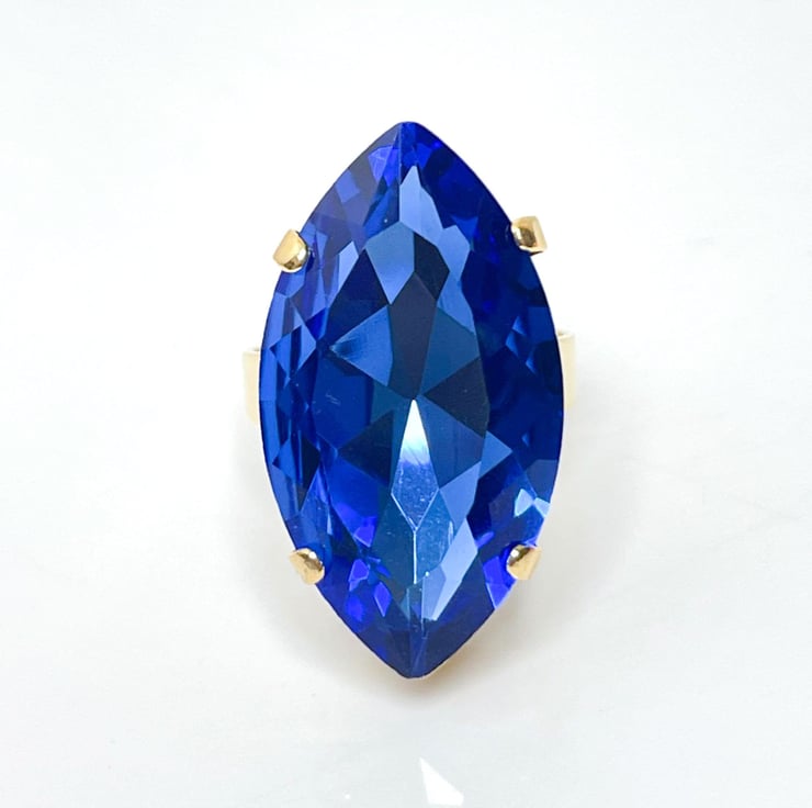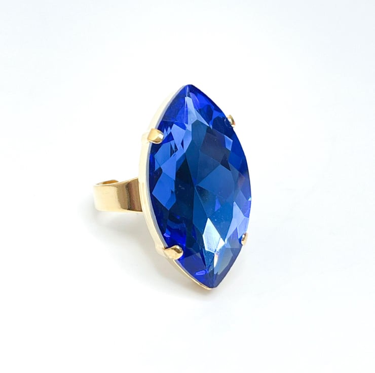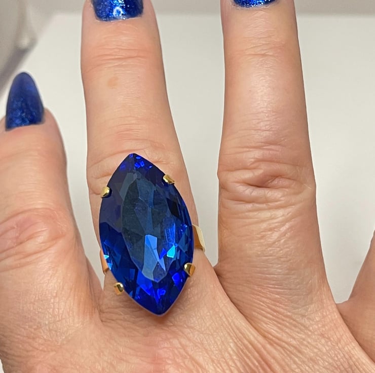 This lovely ring is created with a very bold 32mm x 17mm Light Sapphire Navette Aurora crystal. It is set into a gold plated nickel and lead free adjustable setting, with other colour settings available.