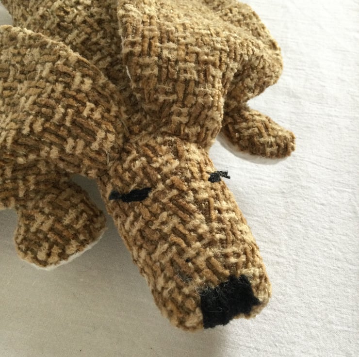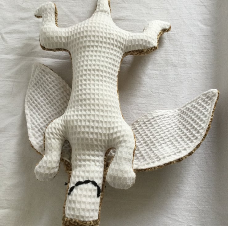 He's made from synthetic mix fibres, cotton waffle belly, and filled with synthetic cotton.