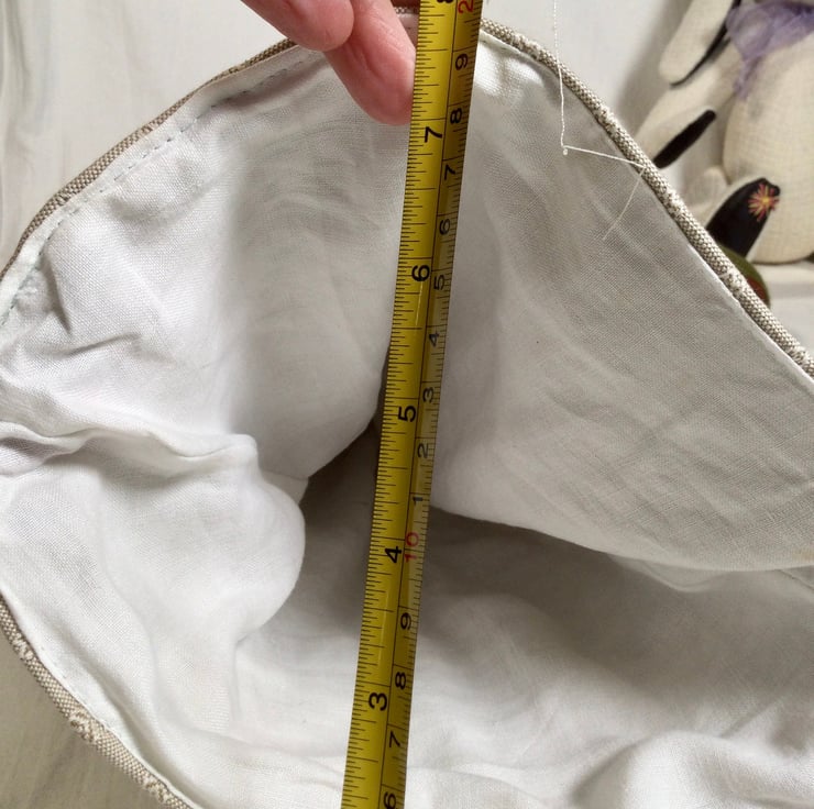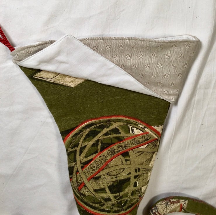 It's made from green and red coloured upholstery fabric with a white linen lining.