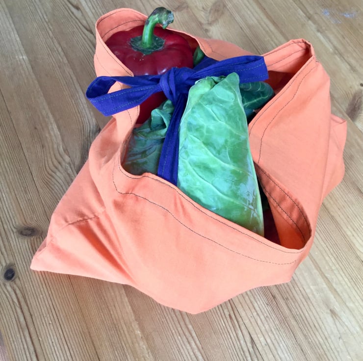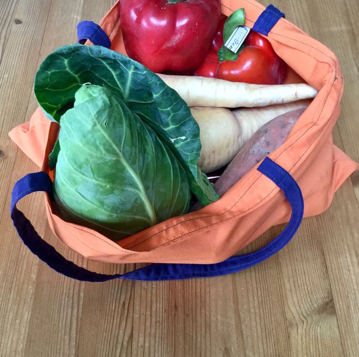 Coloured, reusable, recycled cotton fruit and vegetable shopping bags.