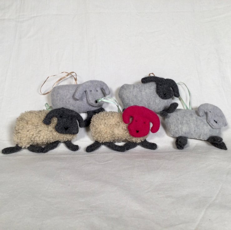 These small handmade sheep ornaments are crafted from recycled fleece and wool offcuts, stuffed and stitched into delightfully dinky companions.