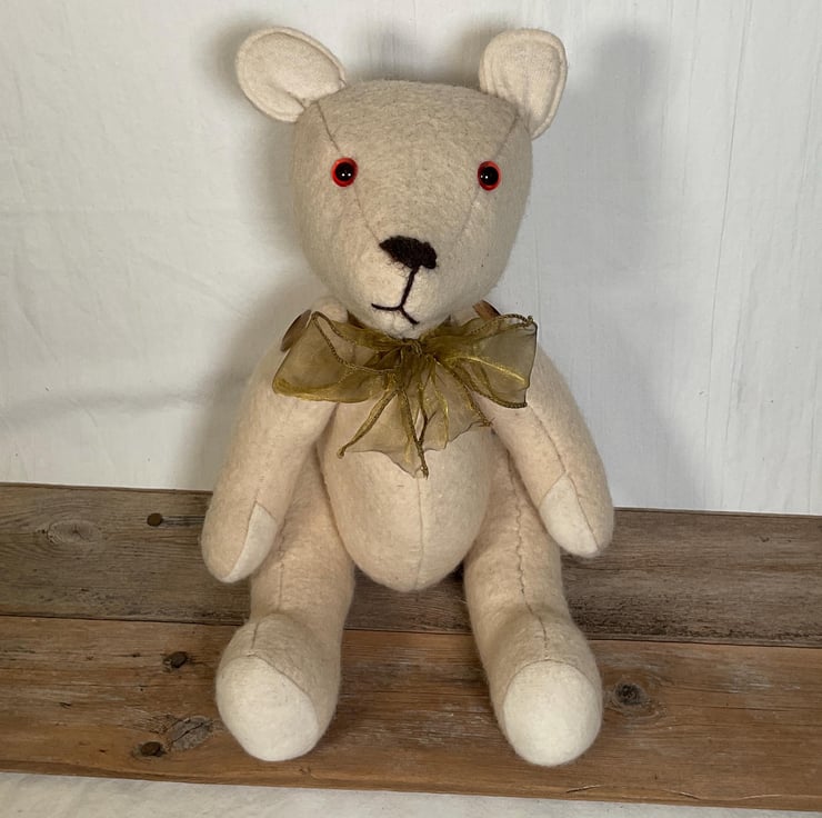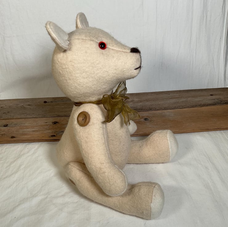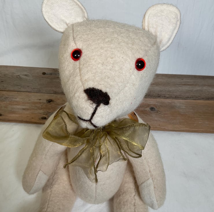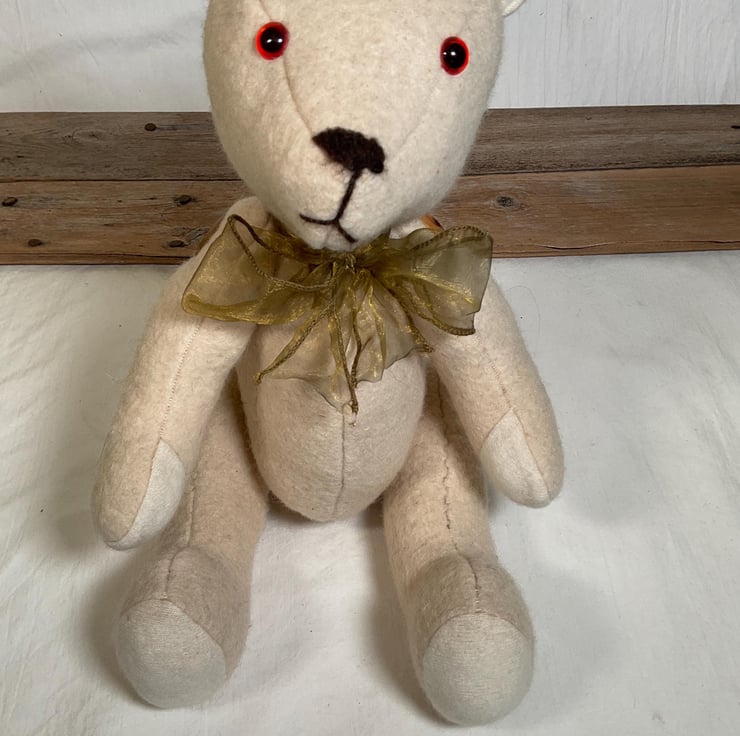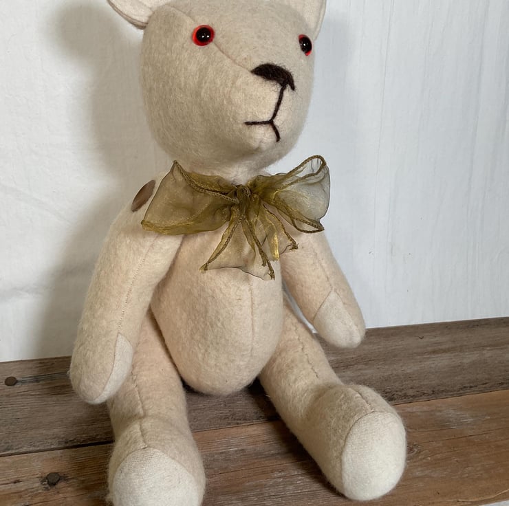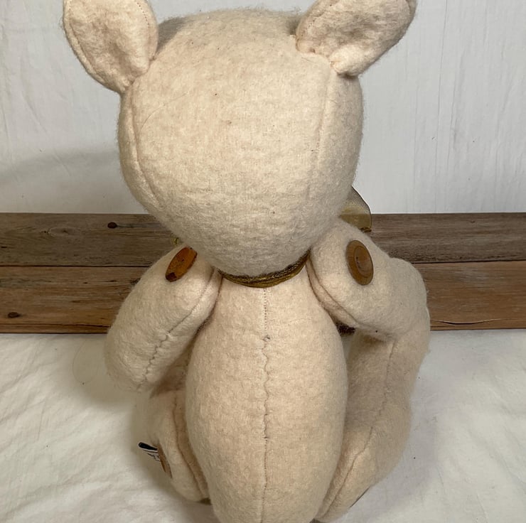 I'm made of vintage wool blanket fabric and I have arms and legs that move so I can hug you.