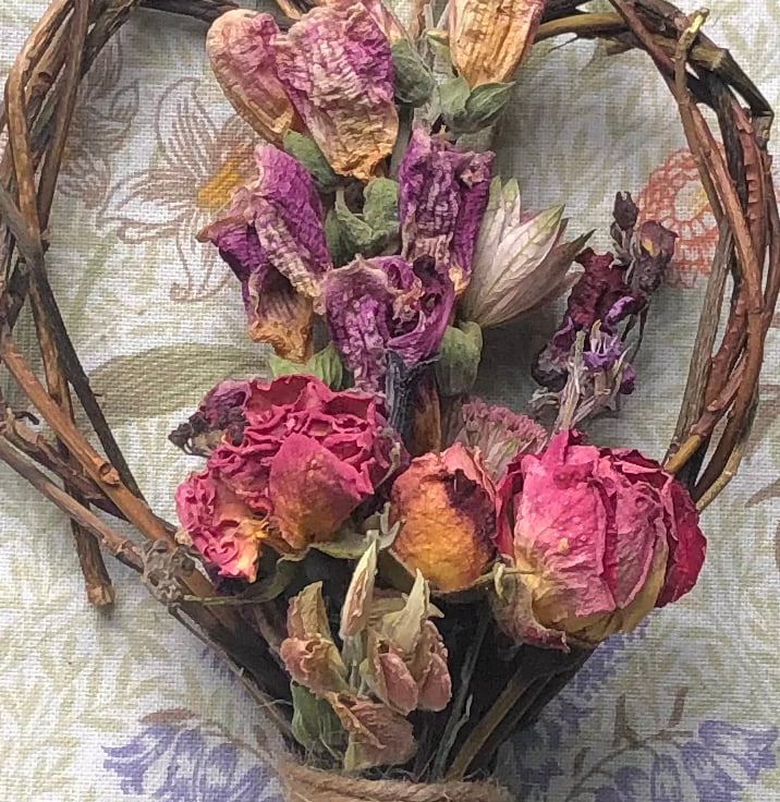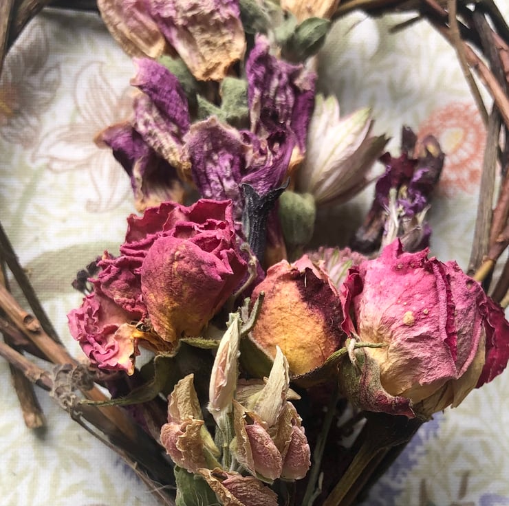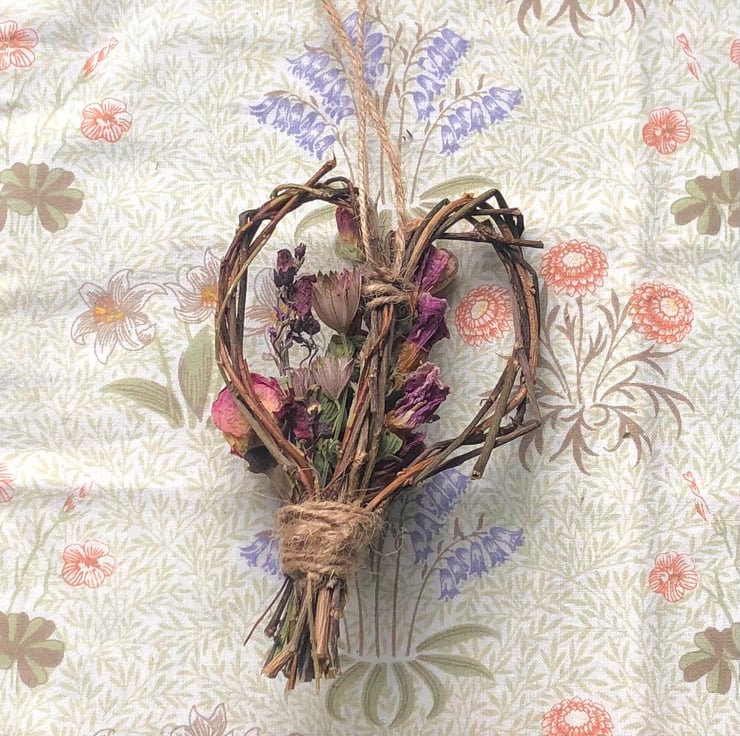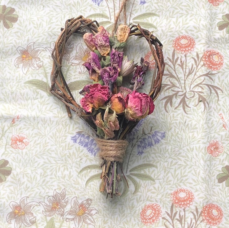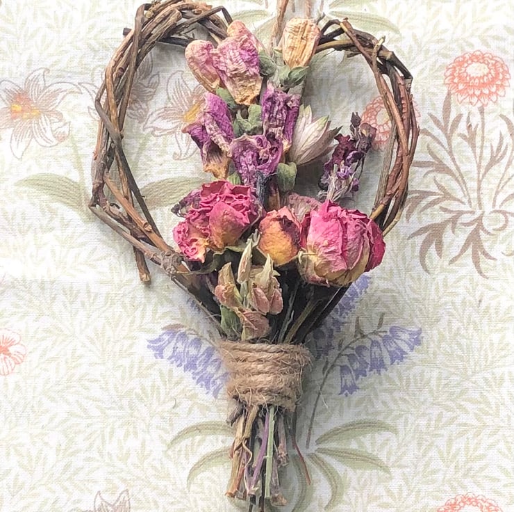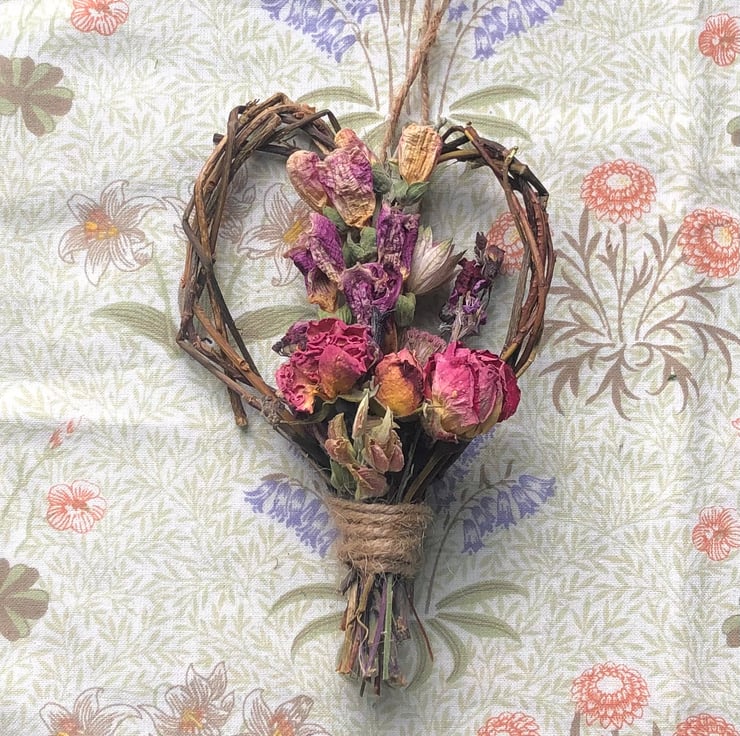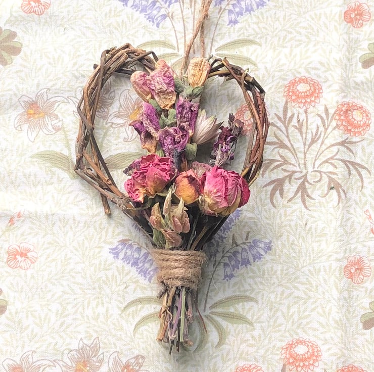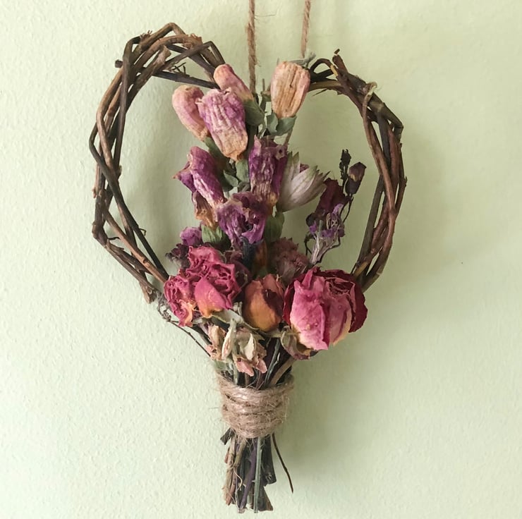 A handmade dried flower heart shape wreath decoration measuring approximately 13x8cm at it’s longest and widest points.
