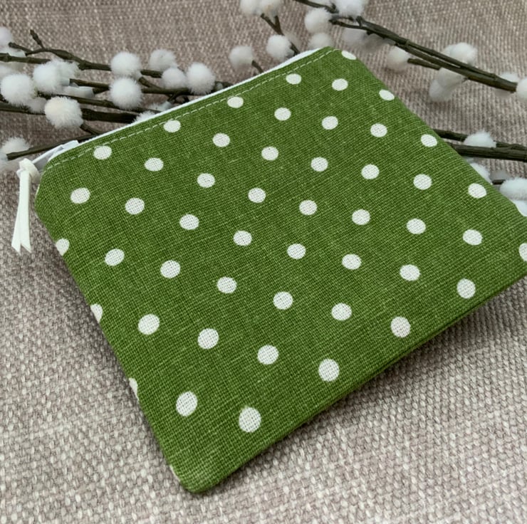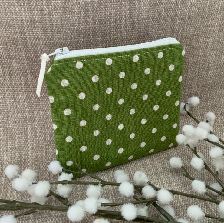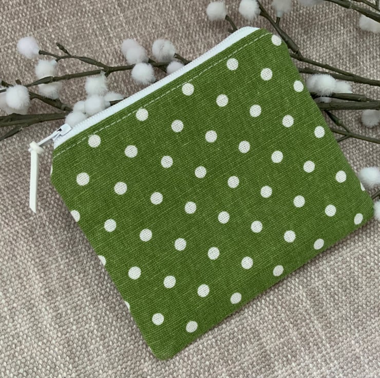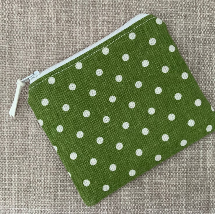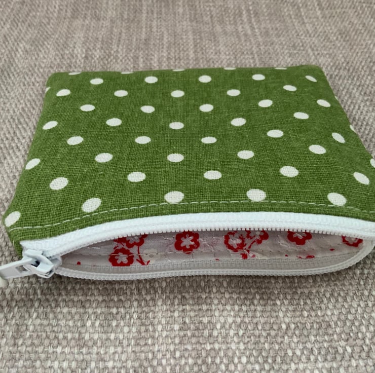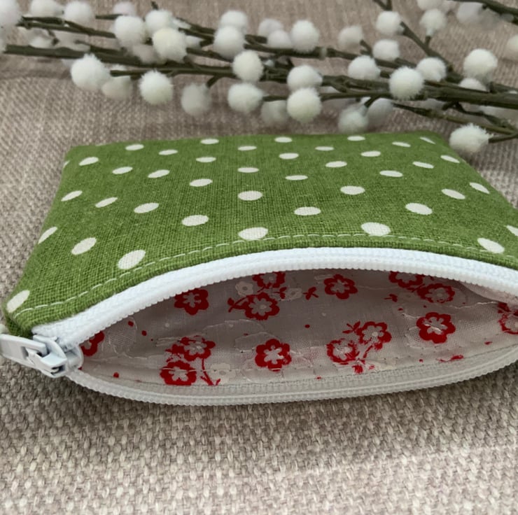 Beautiful coin purse made from cotton fabric with a green spot design. It is lightly interfaced to give a little structure. It is lined in floral fabric and finished with a faux suede cord attached to the zip.