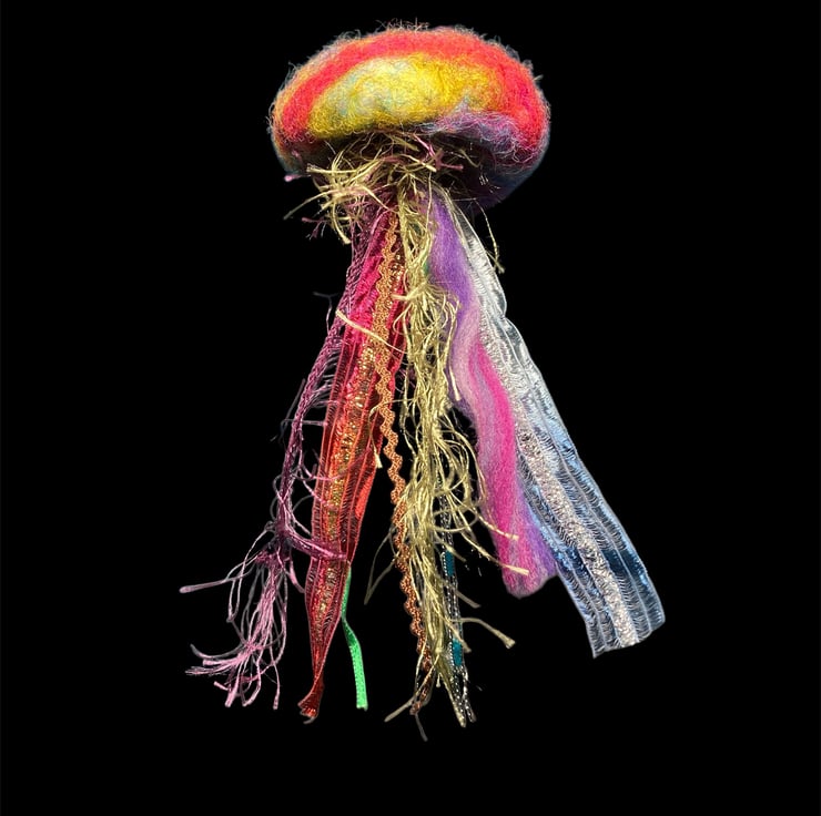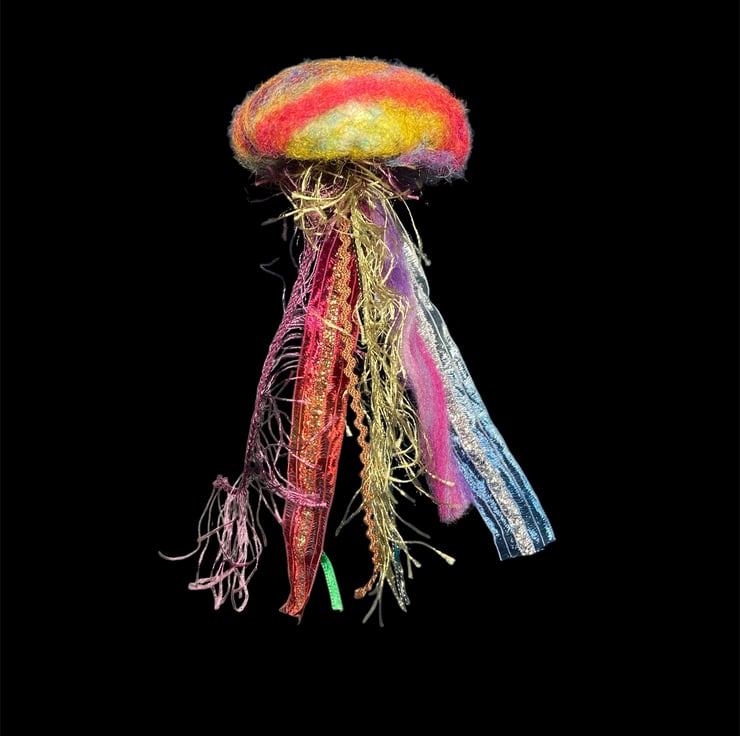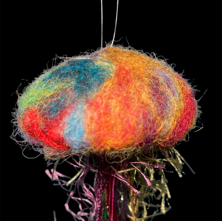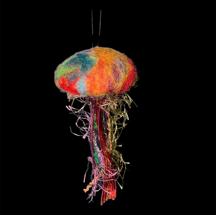 This fun needle felted jelly fish has been created using multicoloured woollen fibres and a variety of ribbons and cords to create the tendrils. A clear nylon hanging thread has been attached to the top.