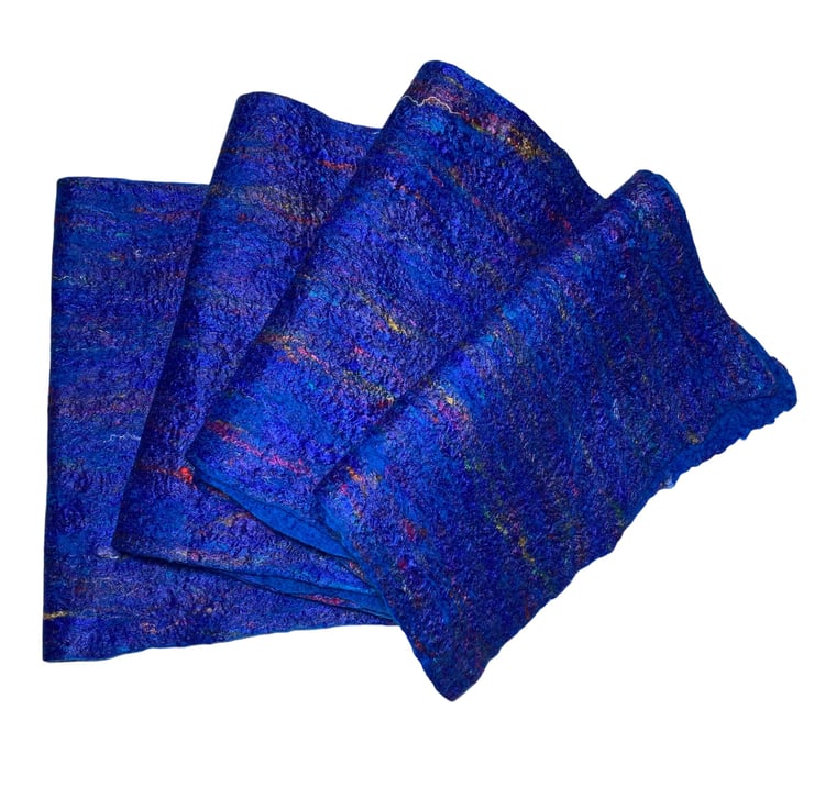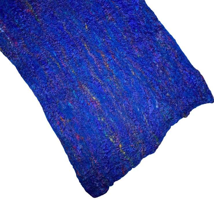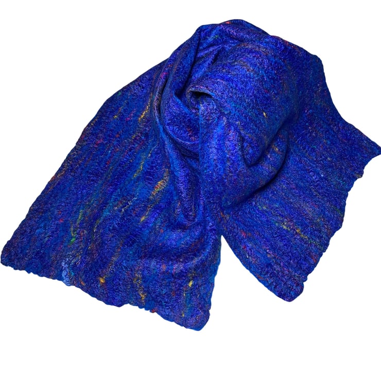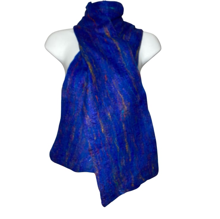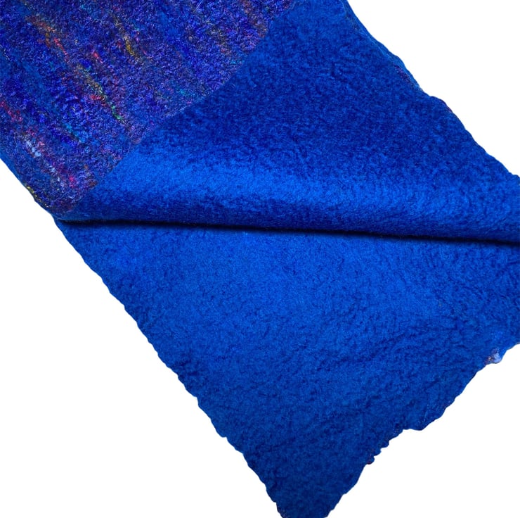 A beautiful felted scarf made from fine layers of royal blue merino wool fibres topped with a layer of recycled sari silk fibres. The scarf has been wet felted, a process that binds the fibres together to create a stable fabric. The scarf is beautifully soft and lightweight and the silk fibres add texture, colour and a lovely sheen to the surface.
