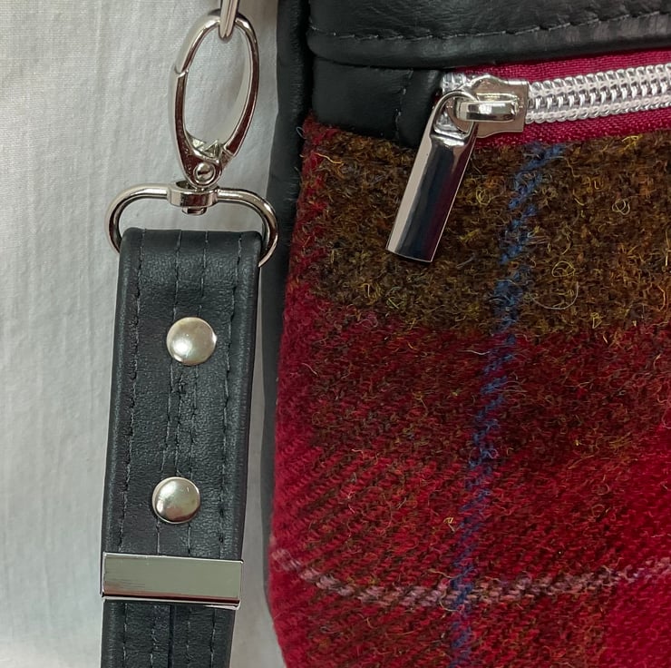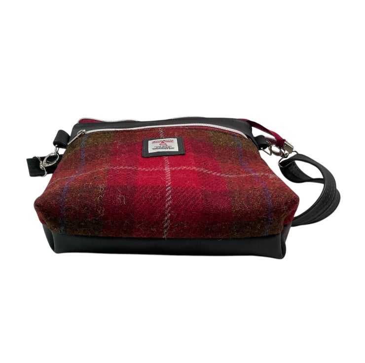This handy sized bag is made of lovely substantial but flexible, genuine cows leather in a black shade. It has been paired with a front pocket made in beautiful Harris tweed in a red, brown and blue tartan print.