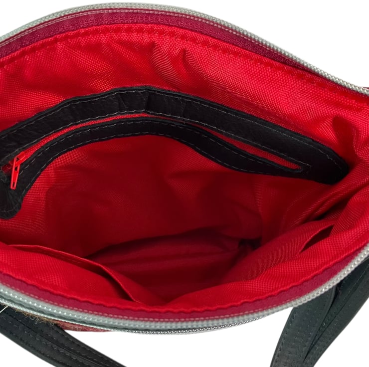 The bag is lined in red water resistant canvas and has a zip pocket with a leather surround internally on one side and a large slip pocket on the other.