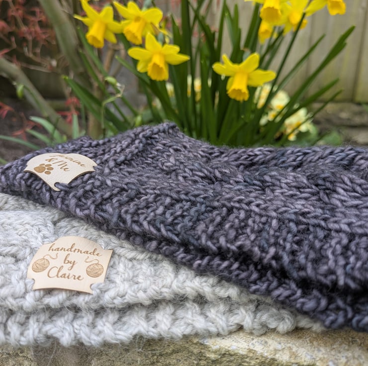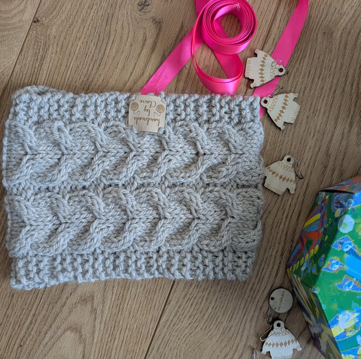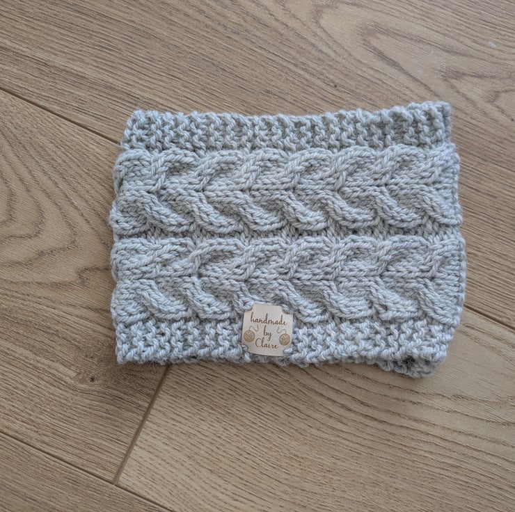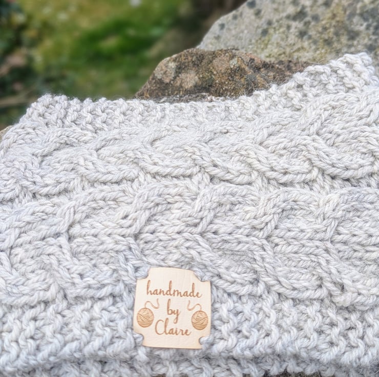 It is a handknit headband or ear warmer, with a central cable pattern. It's very soft as it's made with alpaca and wool - 65% wool and 35% alpaca.