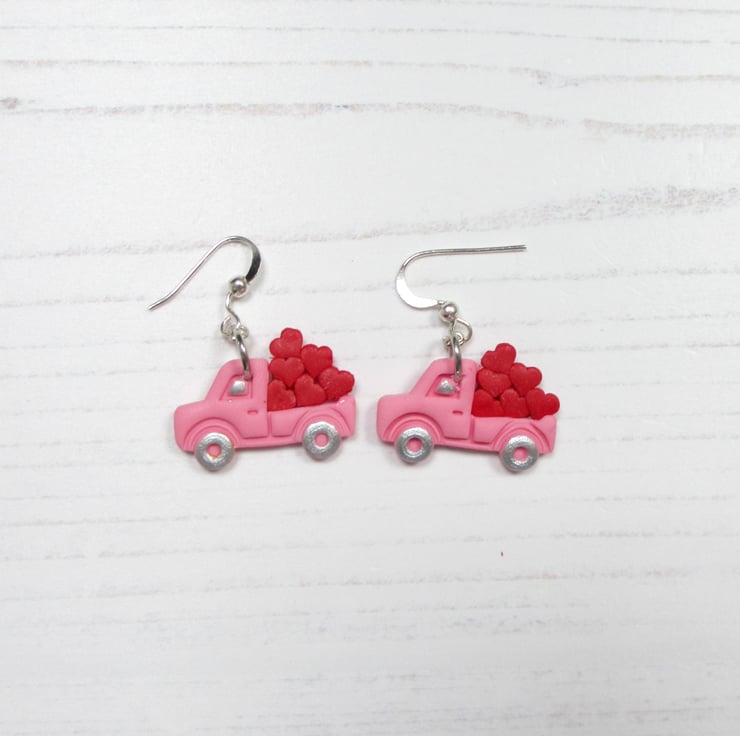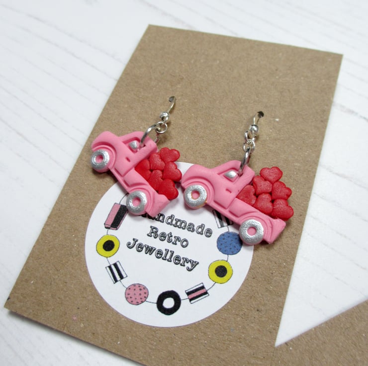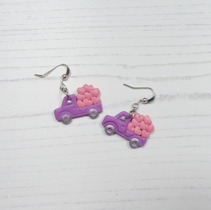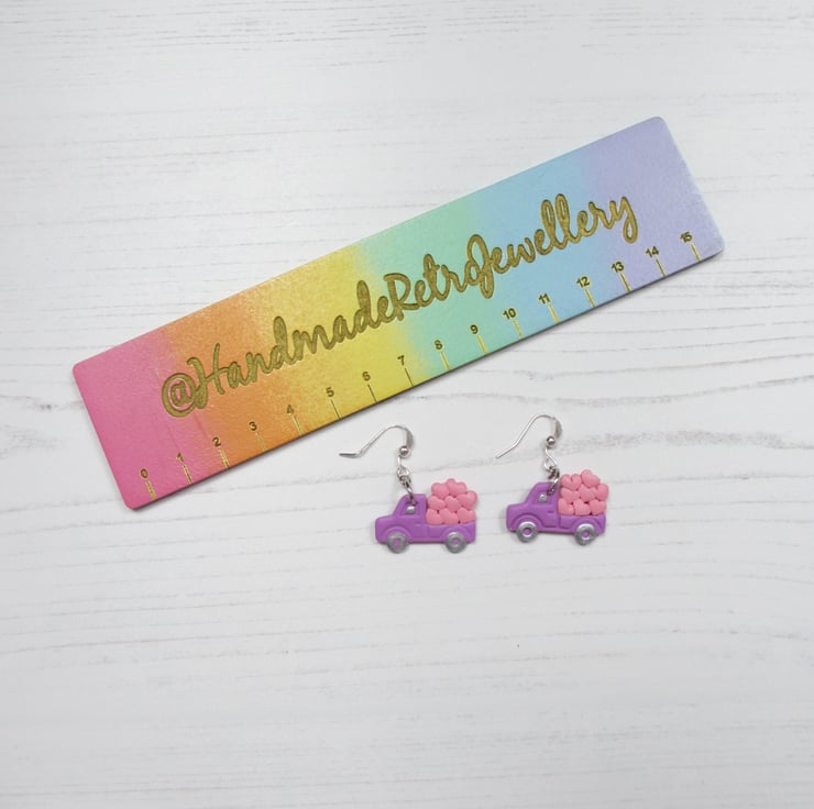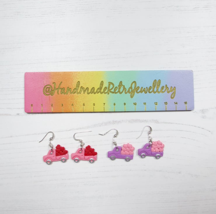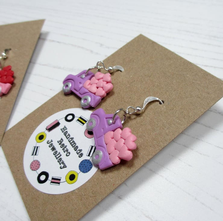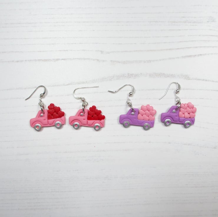 All items are handmade in Britain by myself. Price is for ONE pair of earrings, choose from Pink Trucks with red hearts, or Lilac trucks with pink hearts
