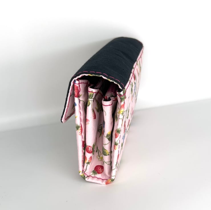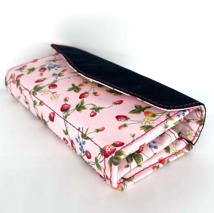 The purse is made with pink cotton fabric with strawberries and leaves print. It is lined using the same strawberry fabric.
