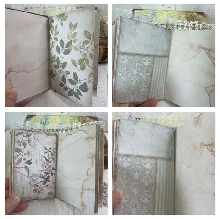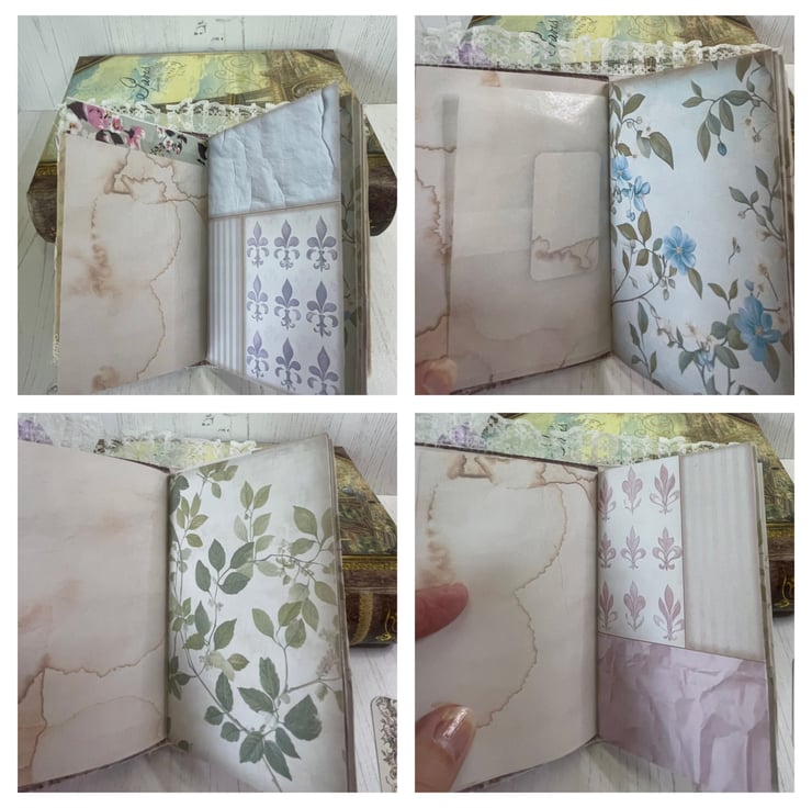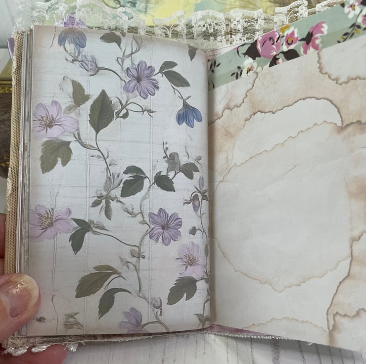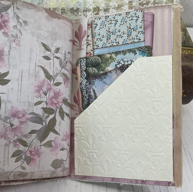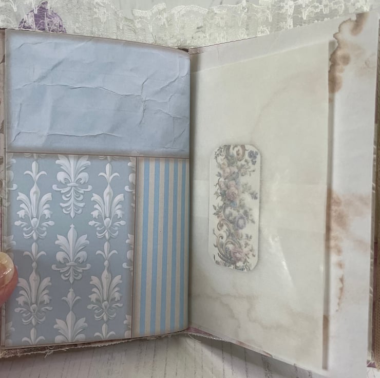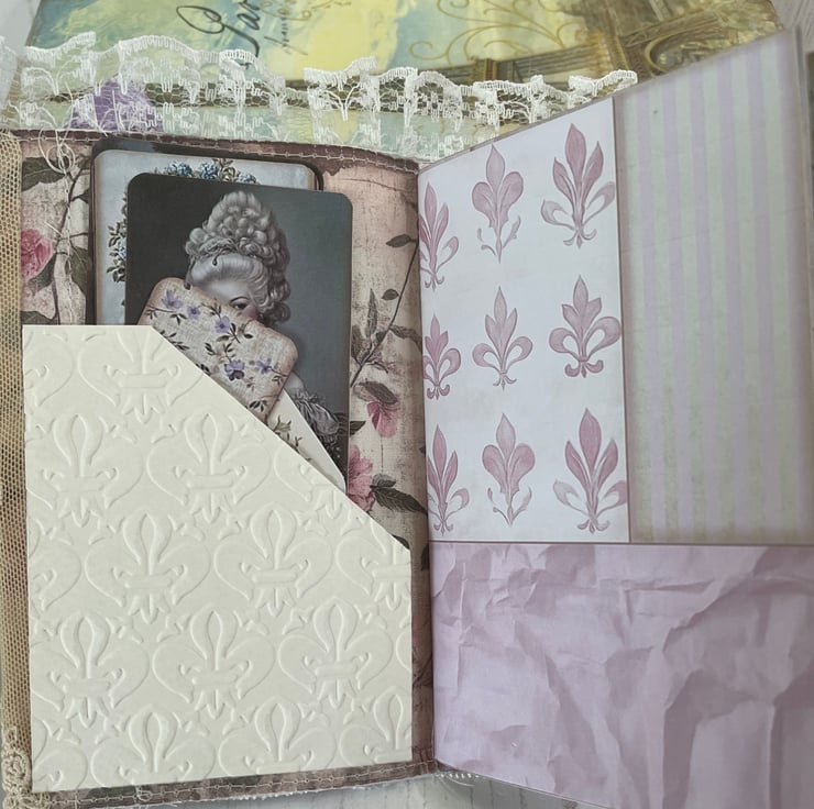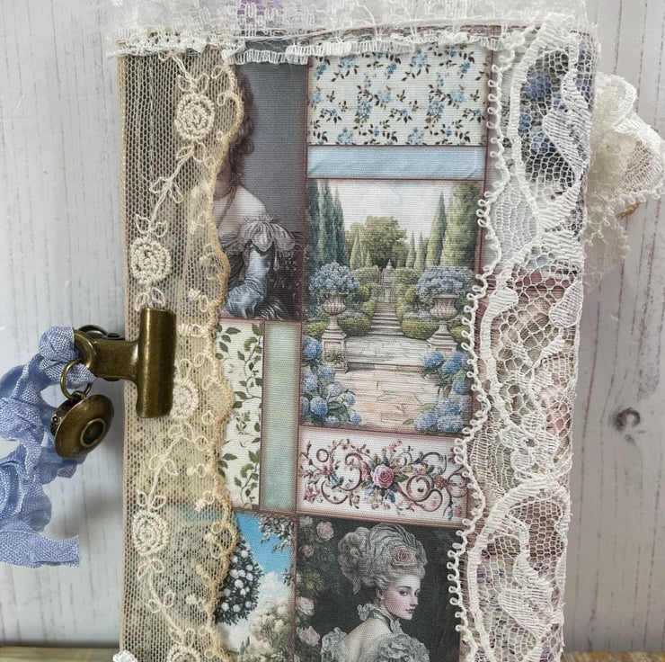 Delightful mini journal measuring 5.75” x 3.25” in a fabric print of Marie Antoinette in her garden. Four different prints gif pages back with a coffee stained print. Total pages 24, with a glassine bag as a pocket in between. Front covered in lace, frame with a Marie image. Lilac bow and petal centre. Dangle of mixed lace with a set of keys charm hanging from a bulb pin. Mini bulldog clip for closure with a blue ribbon and tea cup and saucer charm. Pockets inside the front and back cover with tags.