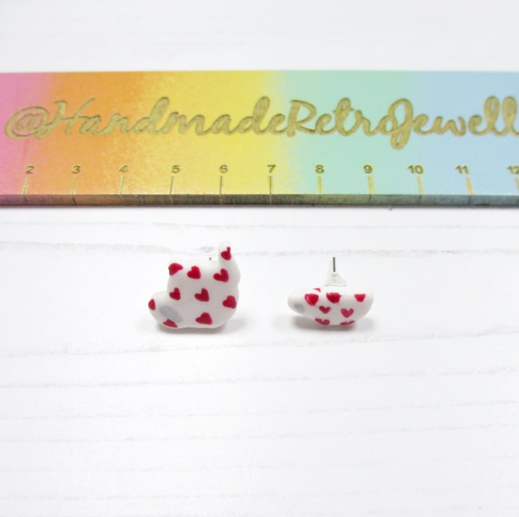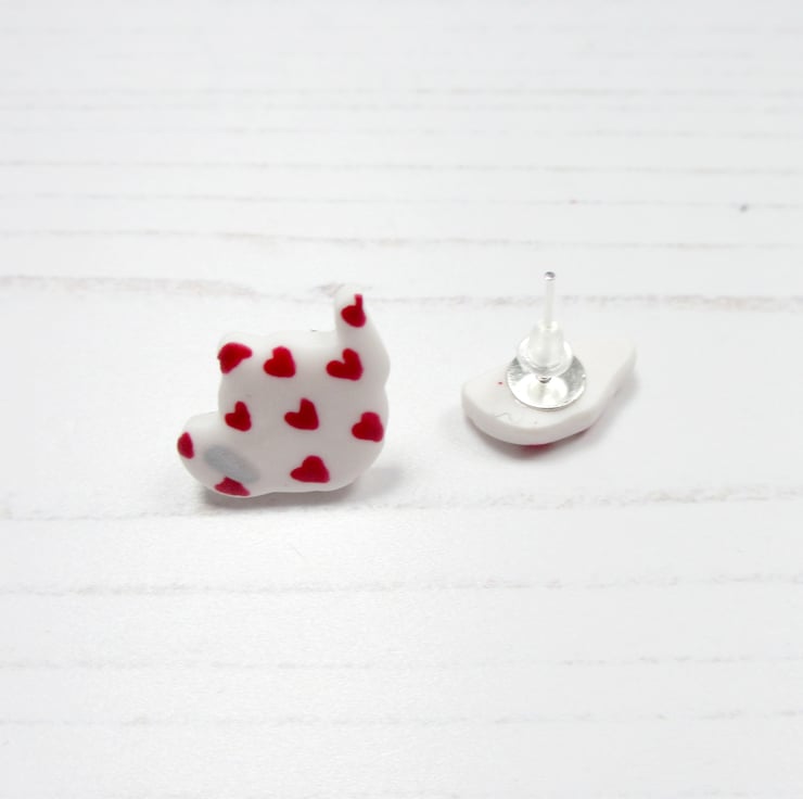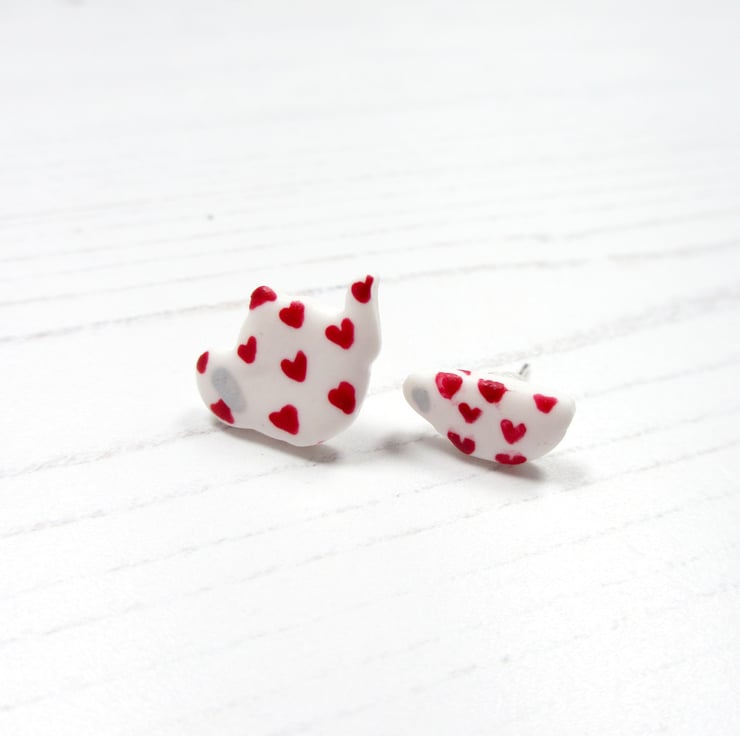 These cute little earrings feature a teeny teacup and teapott with a hand painted hearts pattern across. Carefully hand crafted using polymer clay, and detail painted with acrylic paint.