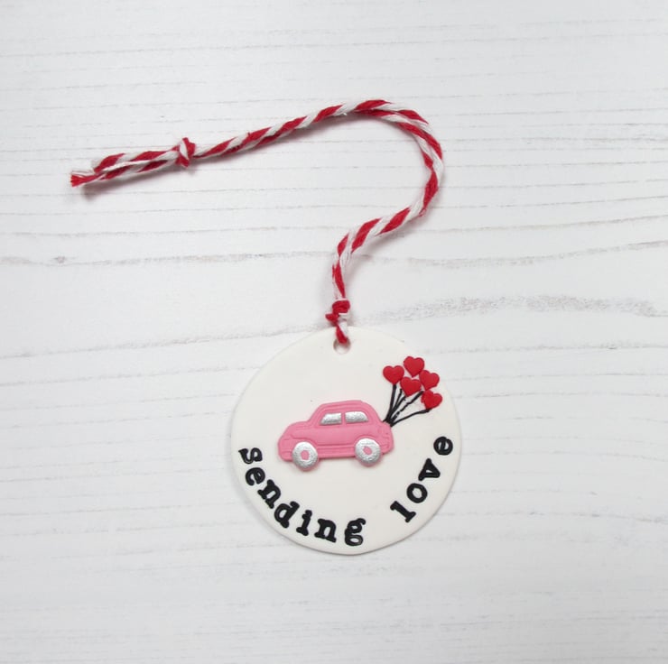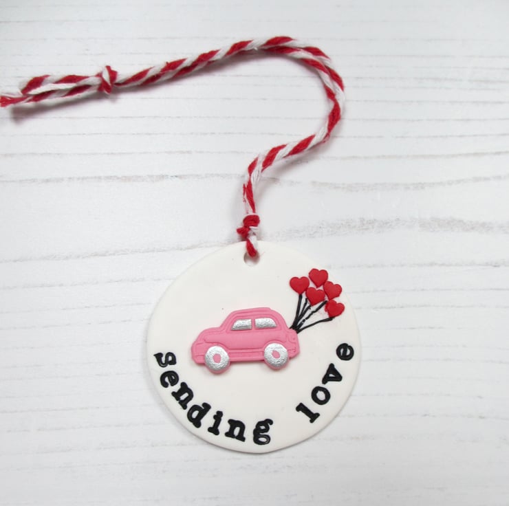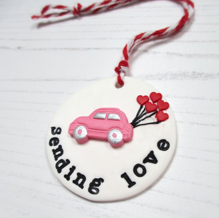 A gorgeous decoration, made of polymer clay, with a candy pink car with bright red heart balloons floating in the air behind . Featuring the phrase "Sending love" stamped by hand using mini individual letters, and detail hand painted using acrylic paint to finish.