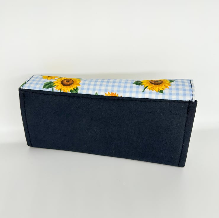 The purse has sunflowers printed on a gingham background on the flap. It is lined using 100% cotton fabric.
