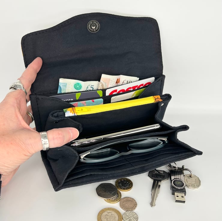 The purse has many compartments, card pockets and has a zipper section to hold coins. There is space to hold notes unfolded.