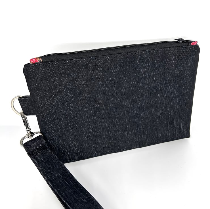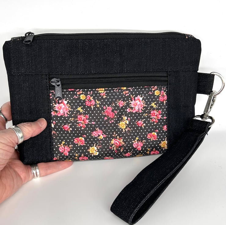 This black denim zipper pouch is made using denim with an accent front pocket black wipeable ripstop fabric with small ditsy floral print and polka dots. The pouch has black zippers with matching zipper pulls.