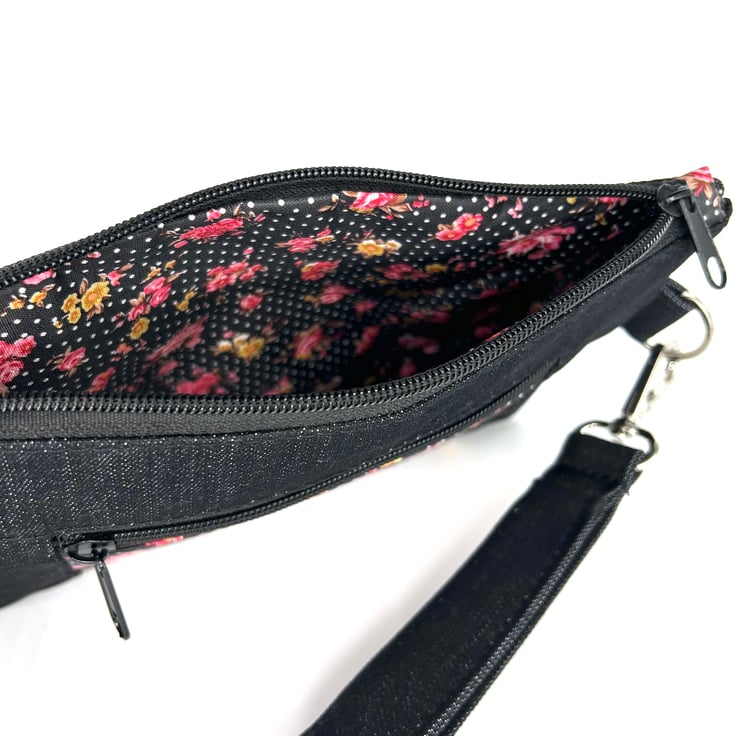 This wristlet bag has strong removable wrist strap attached with a heavy duty dog clip and d ring.