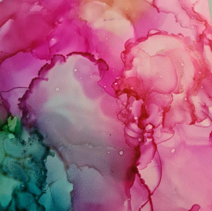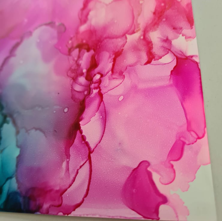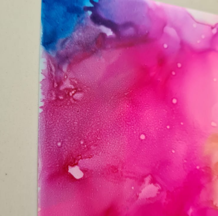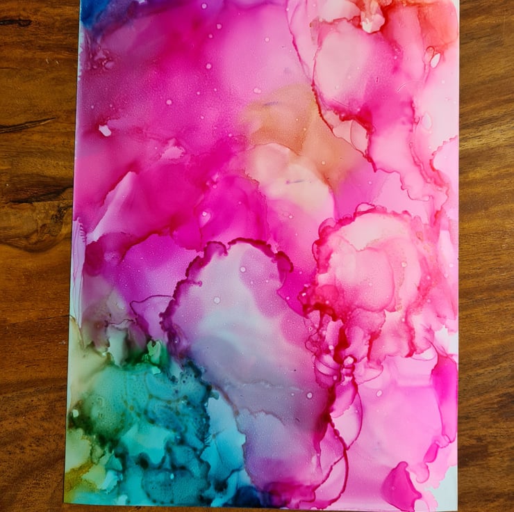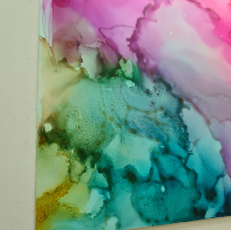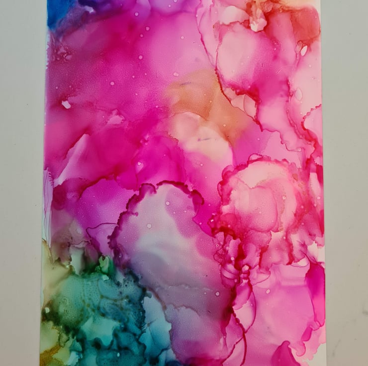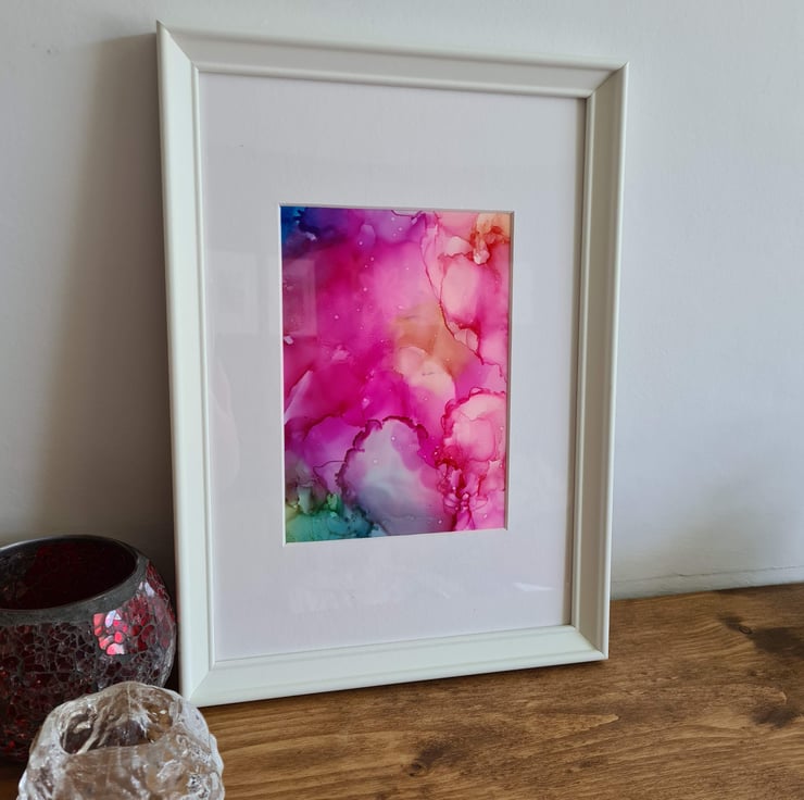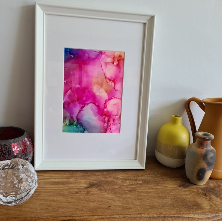 This is an original alcohol ink painting (not a print), created by me, using quality pink/yellow/blue/green alcohol inks on Yupo paper and finished with 2 coats of spray varnish to protect the inks. These bright colours blend to make a brilliant mixture of colours. This painting would look lovely in many places, e.g. a living/dining room, child's bedroom, a gallery wall or as part of a picture ledge display.