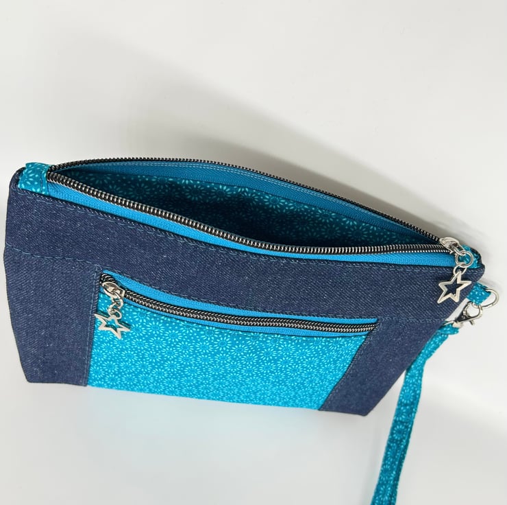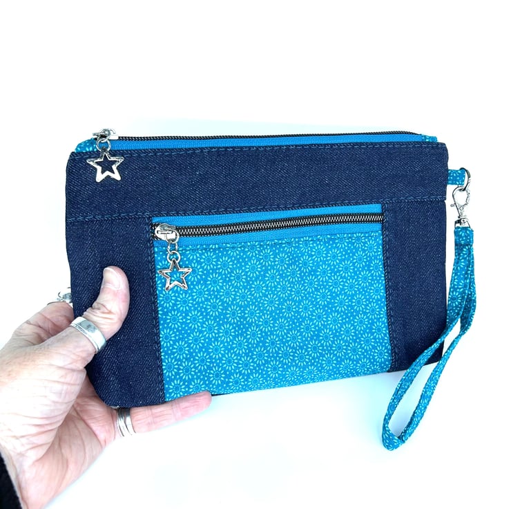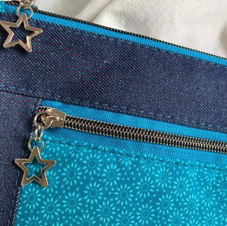 This blue denim zipper pouch is made using denim with an accent front pocket with blue tiny dot floral print. The pouch has blue zippers with matching star zipper pulls.