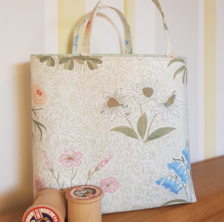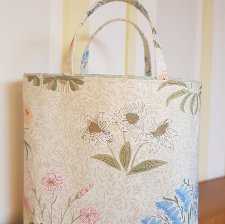 Handsewn by me with cotton fabric it is lined and interlined so will keep its shape. And it can be used to keep something in so has a future use too.