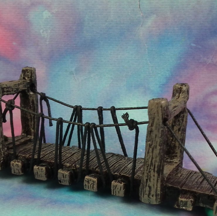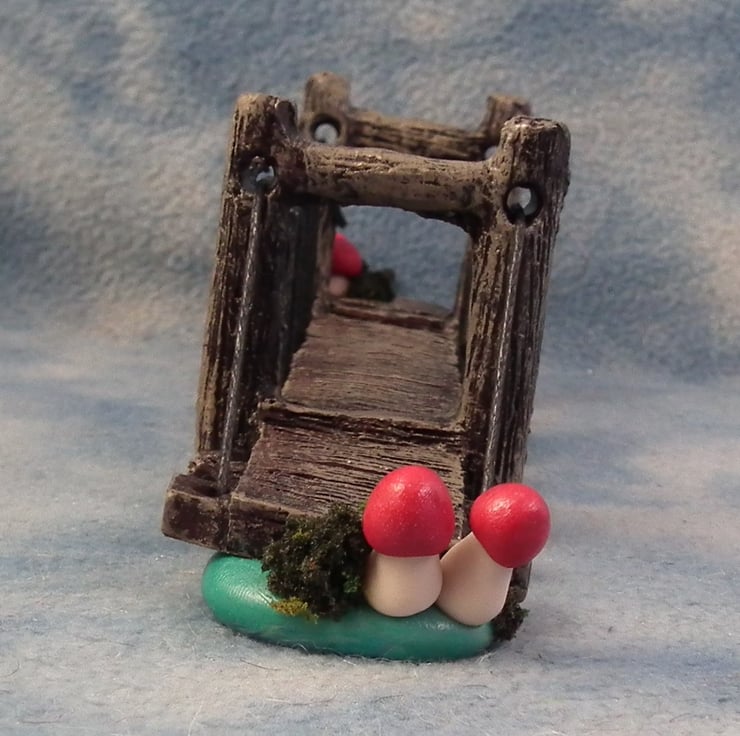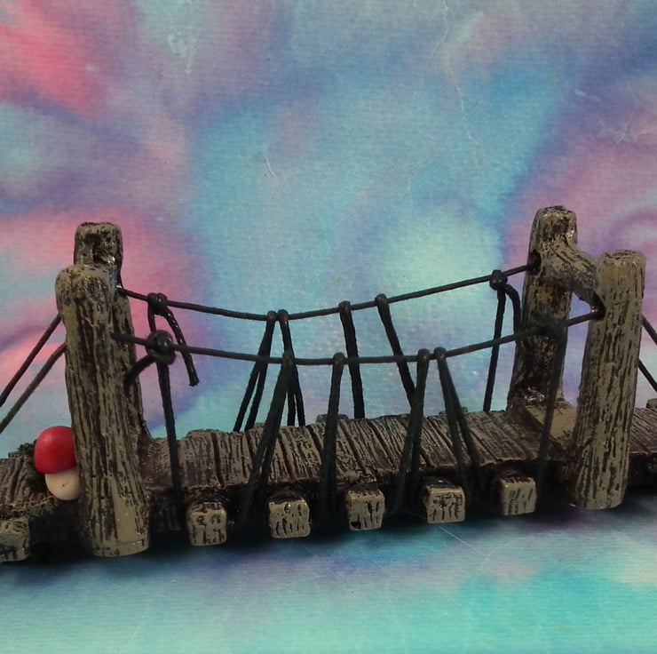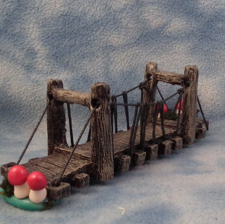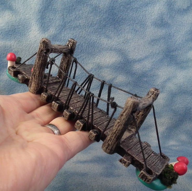 A resin bridge with faux moss and vegetation ... seven inches long, two inches wide. Gnomes need a river-crossing from time to time ... or maybe need to do a little fishing ...