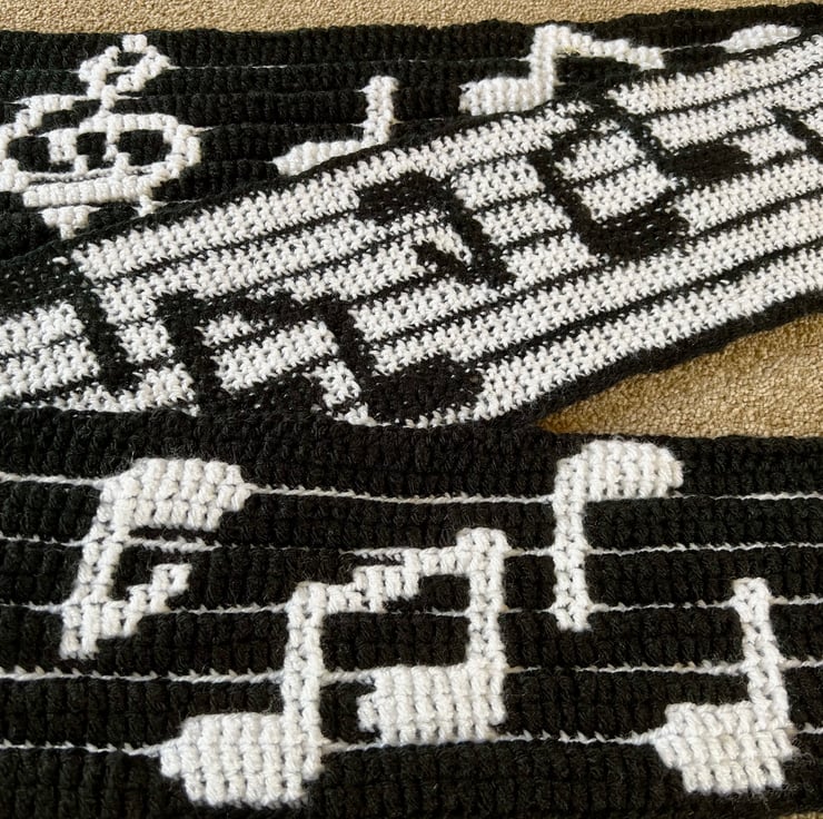 This is made using a mosaic crochet stitch all the way along and is double sided. The scarf should be hand washed and reshaped while wet.