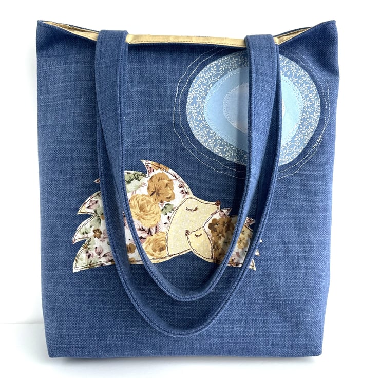 A tote bag in dark blue upholstery fabric with an appliqué scene featuring two sleepy hedgehogs, one small and one large, under a full moon. The hedgehogs are made from a pretty floral print fabric in shades of golden-beige, golden-brown, dusky pink and green on a white background. Their heads are a lovely vanilla colour with tiny white polka dots. Their outlines, noses and sleepy eyes have been free motion embroidered. The moon is made from concentric layers of different print fabrics in shades of pale blue and white, outlined with white rings of free motion embroidery. The bag is lined with vanilla coloured fabric with a pattern of tiny squares in the weave.