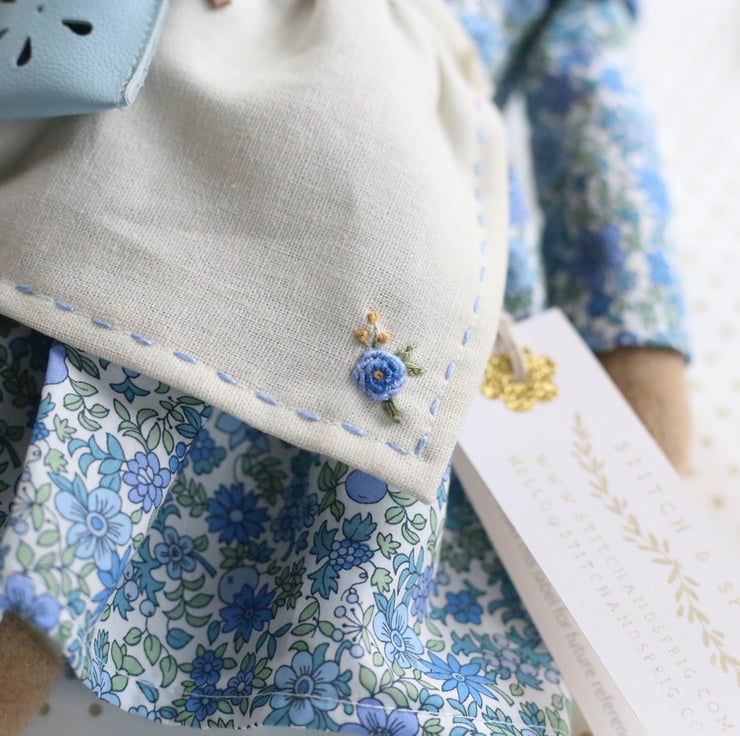 Her apron is made from cotton/linen fabric and embroidered with tiny running stitches and a little sprig of flowers.