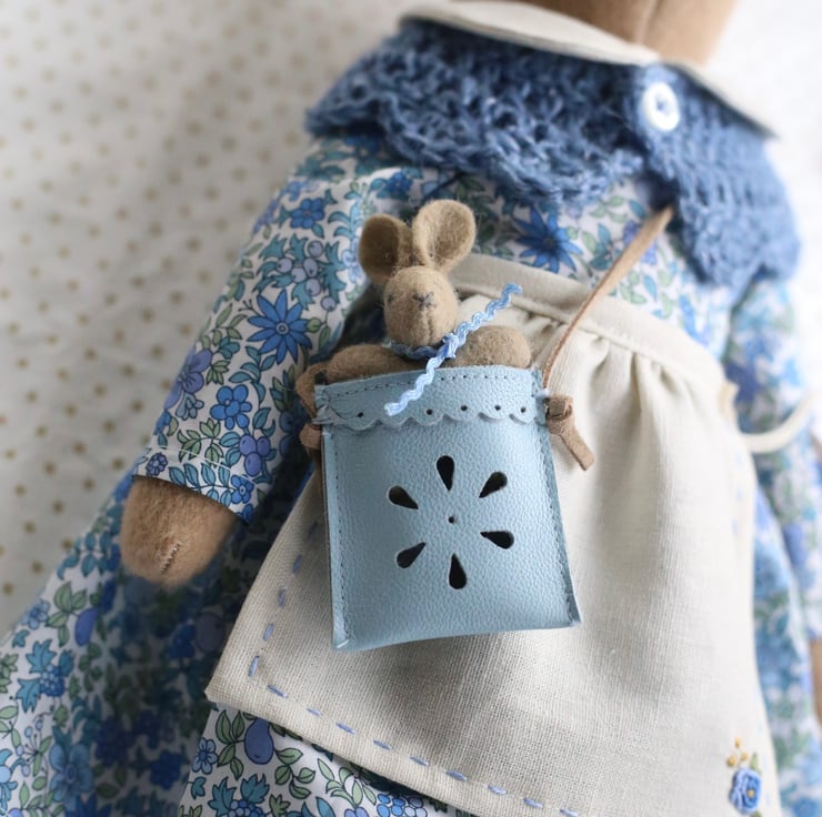Her accessories include a tiny leather bag, hand punched with a daisy design and containing a baby bunny with a ric rac tie.