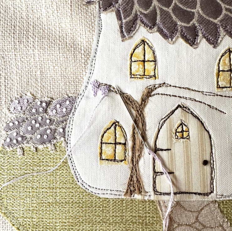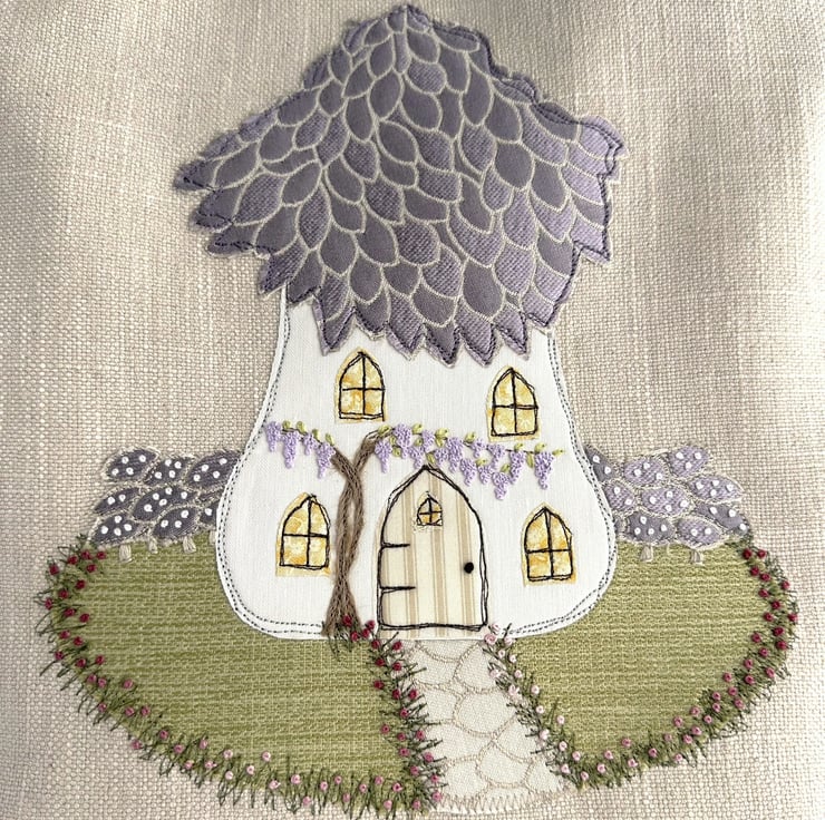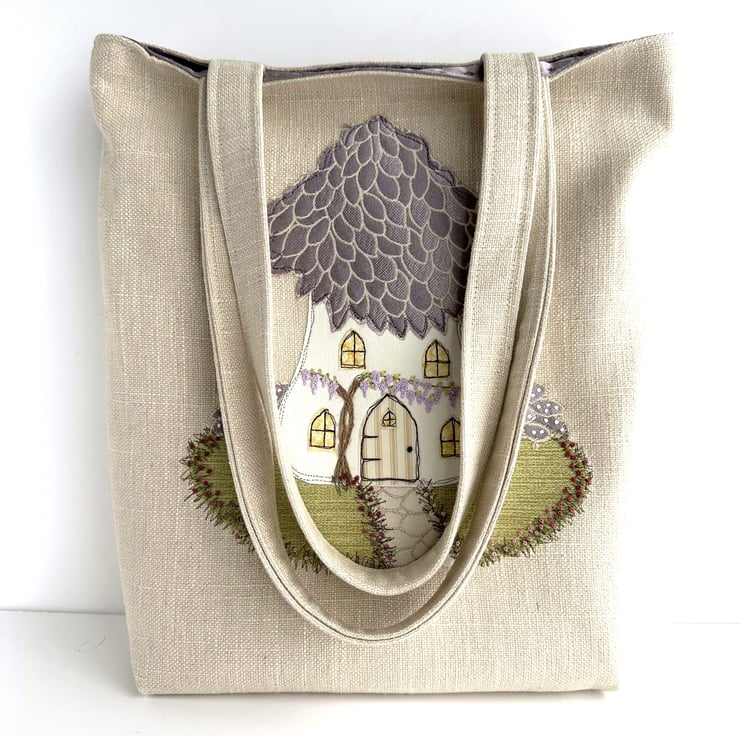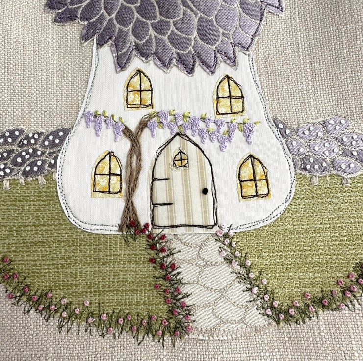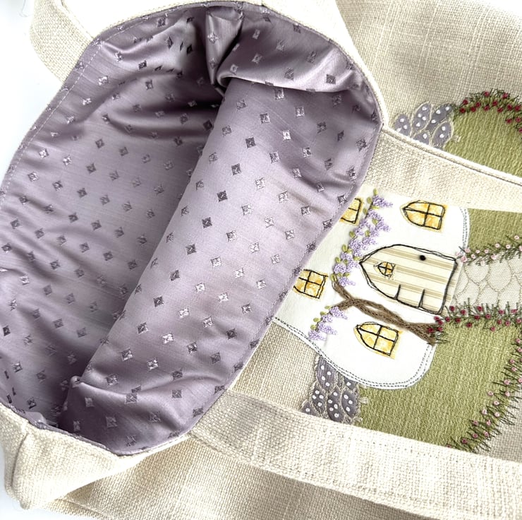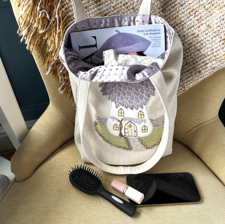 A cream tote bag with an appliqué, free-motion and hand embroidered scene depicting a fairy house and garden. The house is made from ivory fabric with a roof of patterned lilac and beige fabric. I’ve used the pattern of the fabric to give the impression of overlapping petals. The arched door and arched windows all have free-motion embroidered detailing. The Wisteria to the front of the house has jute twine as the stems, and hand embroidered flowers and leaves. The lawn is zesty green fabric and has a path of beige fabric with a pattern that resembles crazy paving. I’ve used free-motion embroidery, and hand embroidered French knots in pink variegated thread, to create flower borders. The garden also contains two clumps of mushrooms, using the same lilac fabric as the roof, but with the addition of lots of white hand embroidered French knots. The bag is lined with lilac satin fabric, with a woven pattern of tiny diamond shapes.