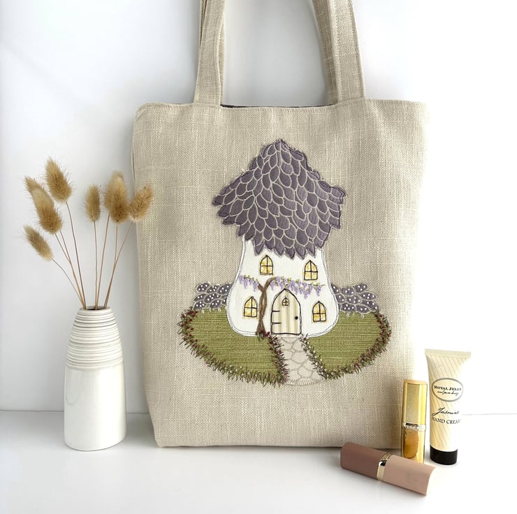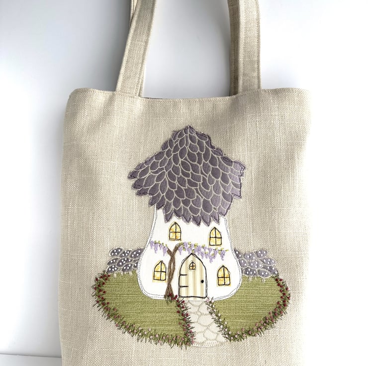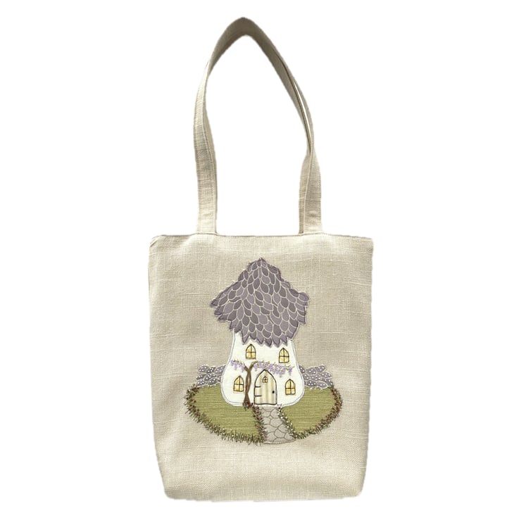 This delightful tote bag is a practical way to appreciate a piece of textile art. With its unique appliqué design, it would make a lovely gift for anyone who loves fairy houses.