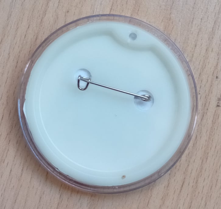 Manufactured from clear acrylic with a clear acrylic back and metal pin.