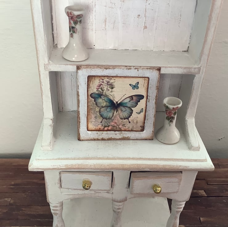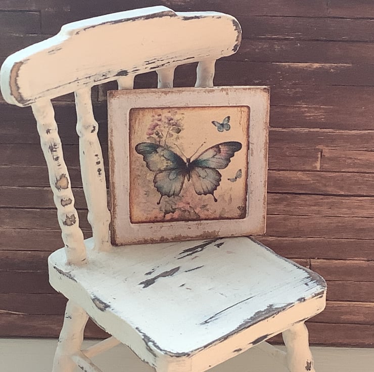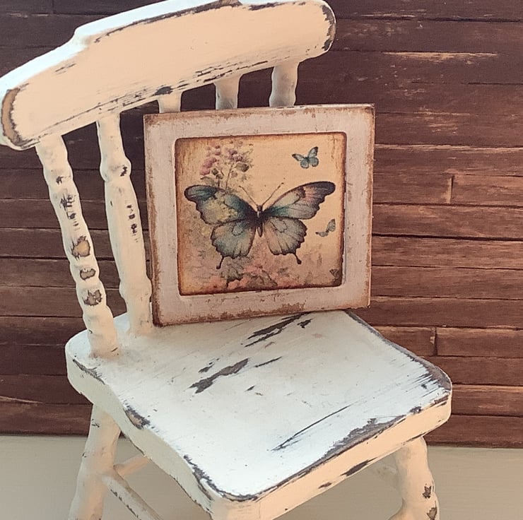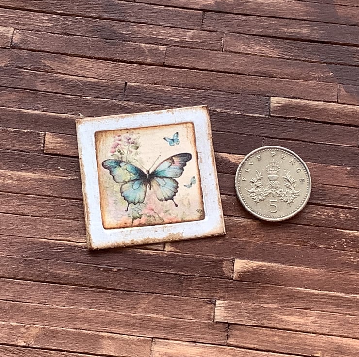 3 x 3 cm Handmade butterfly picture. Made using a thick card and paint that has been sanded in areas to give it a worn look.