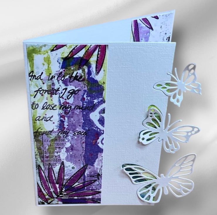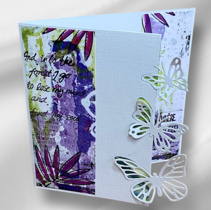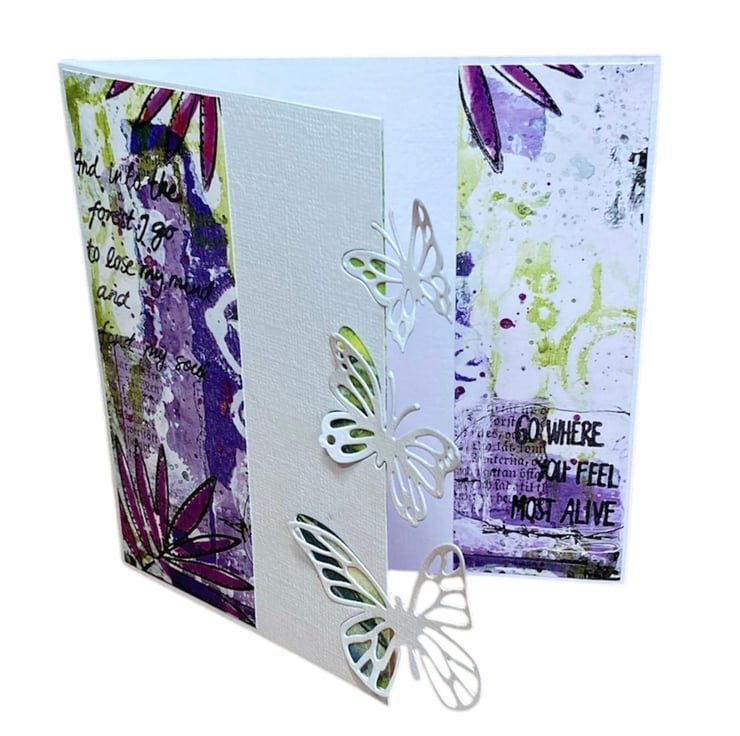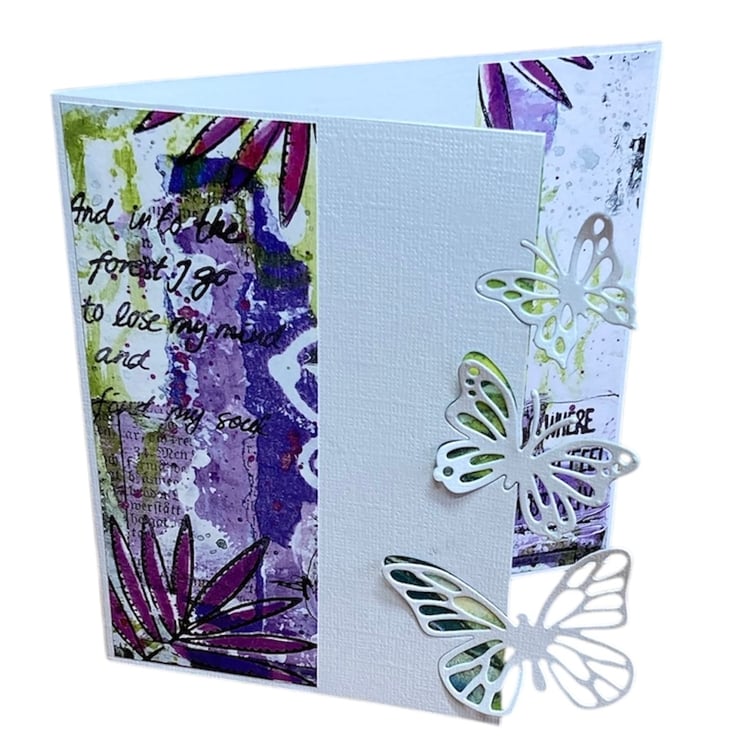 Crafted from quality white linen card, it features an elegant shaped design with delicate die-cut butterflies. The front is decorated with a purple floral paper printed with the words: