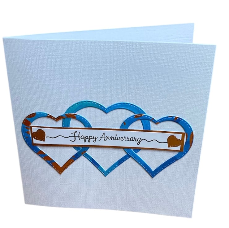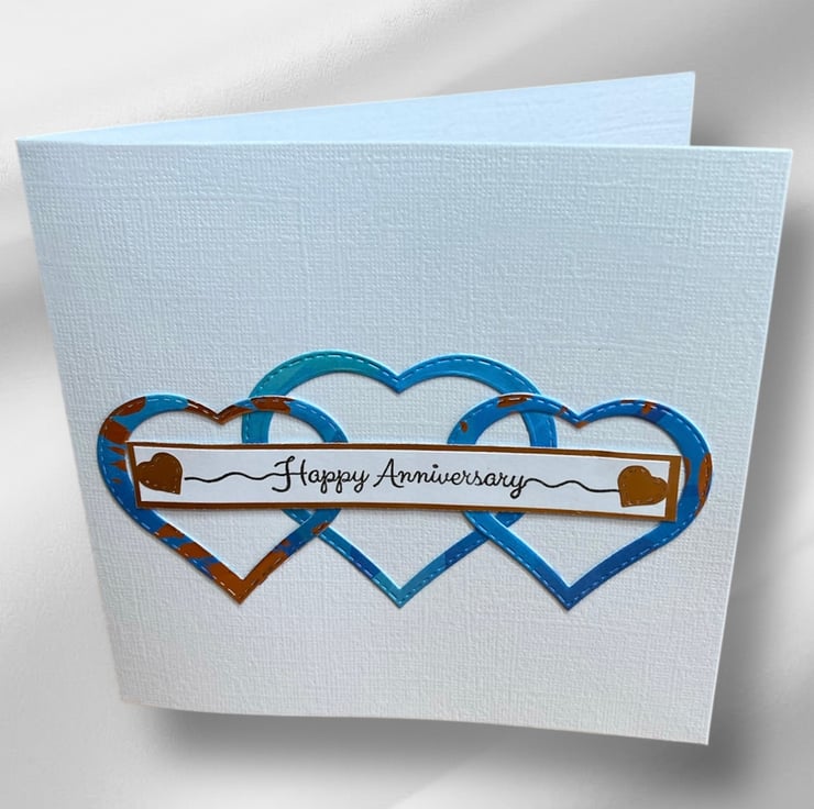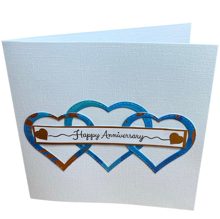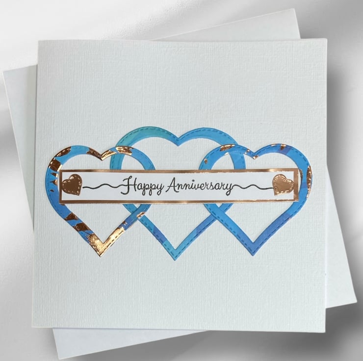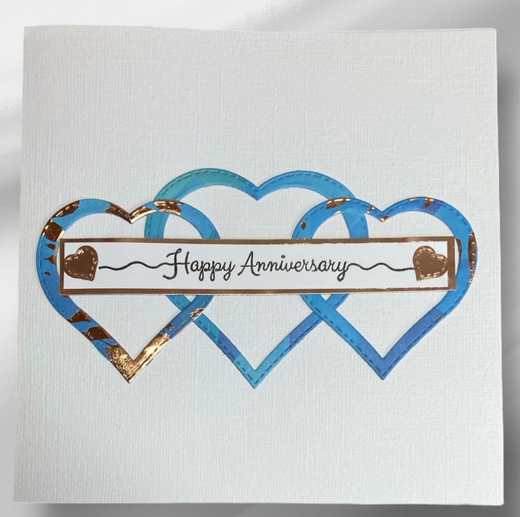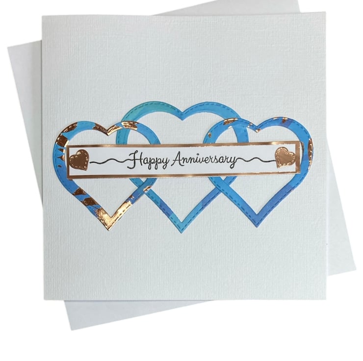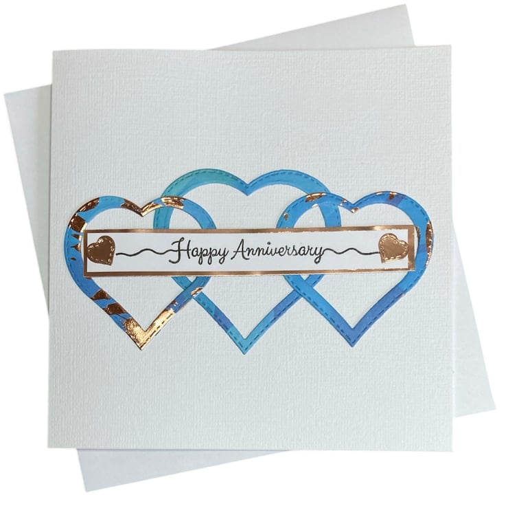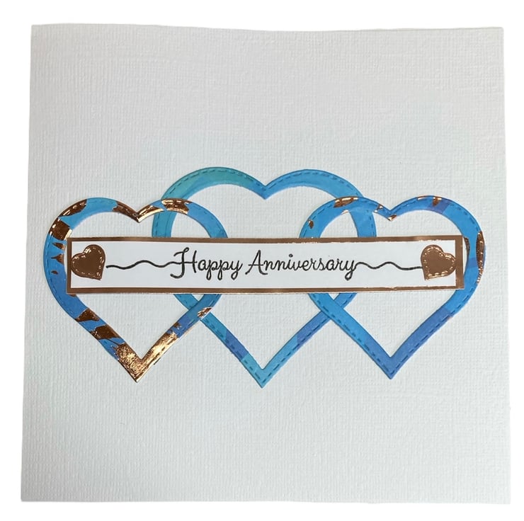 Blue and copper foiled hearts have been added to the white linen card base. The words Happy Anniversary have been hand stamped onto white card which has been applied to a copper foil strip. Little copper hearts have been added.