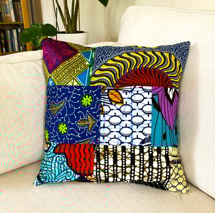 A patchwork cushion cover made from bright and crazy patterned pieces of West African wax-printed cotton with a plain blue heavy cotton envelope back. The cushion measures 40cm x 40cm and in the main photo I have used a 40cm x 40cm pad which seems ideal to me. All pieces were washed before cutting and sewing and I would suggest light sponging if any future cleaning is needed as dark colours can still run.