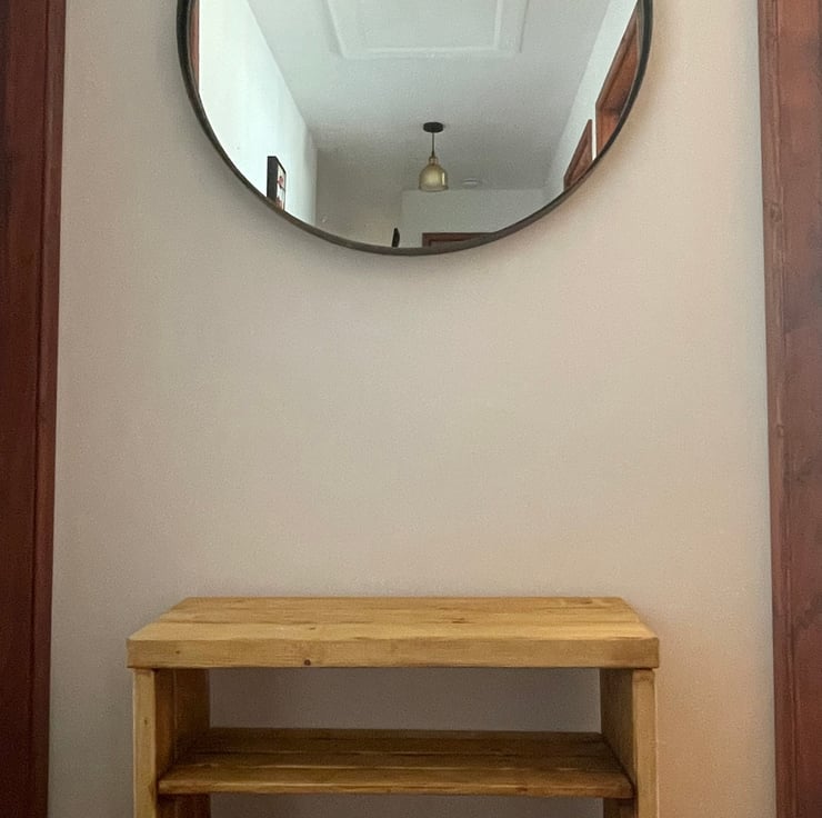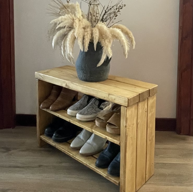 Practical handmade bench that also combines as a shoe rack. Made from solid, new timber. Includes two built in shelves with room for up to six pairs of shoes.
