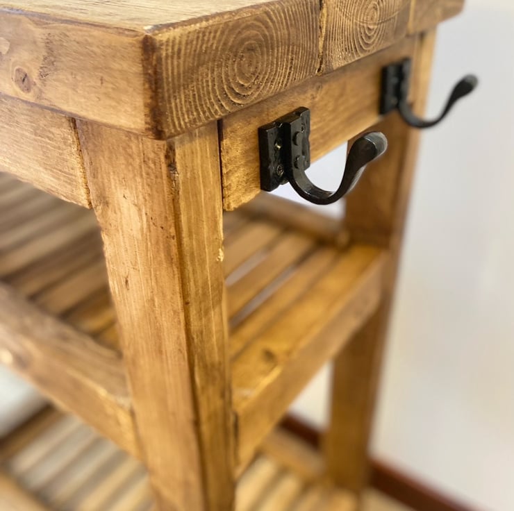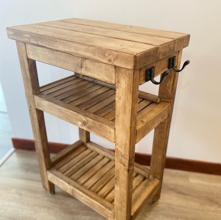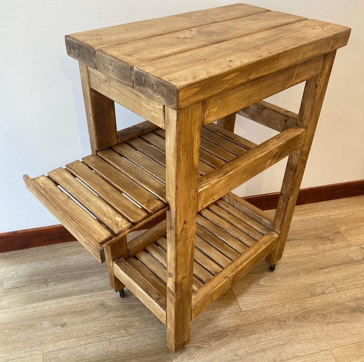 Standout, handmade kitchen trolley crafted from new and sustainable pine wood. Includes sliding shelf and two rustic utensiltowel hooks for those looking for a versatile and efficient kitchen feature. Includes castors for easy mobility.