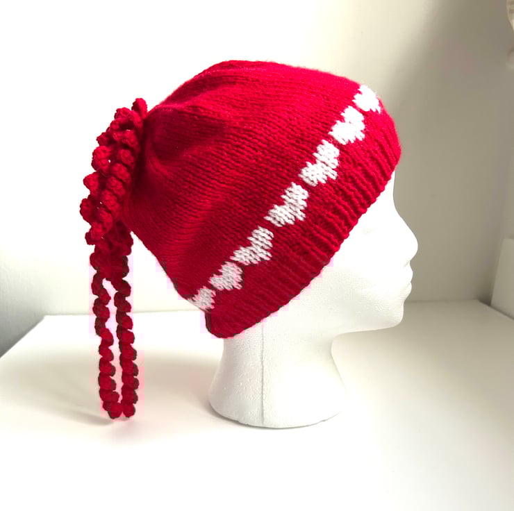 Knitted in premium acrylic yarn in red with a border of white hearts and decorated with crocheted squiggles. This would make a lovely warm hat for a gift or for yourself!